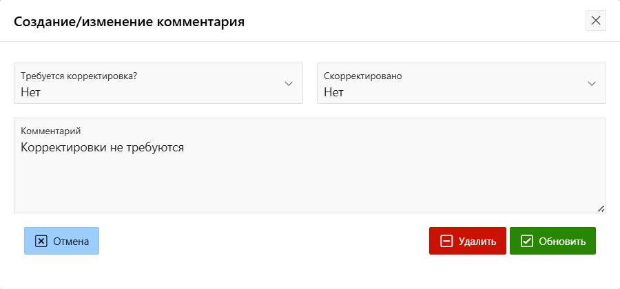 • В окне «Создание/изменение комментария» заполните «Требуется корректировка?», «Скорректировано» и поле «Комментарий».