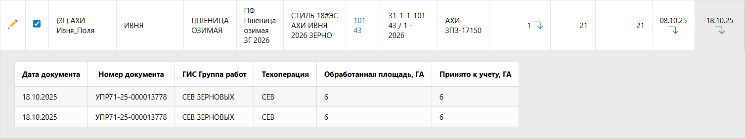 • раскрытие детализации по работам (дата документа, техоперация, площади);