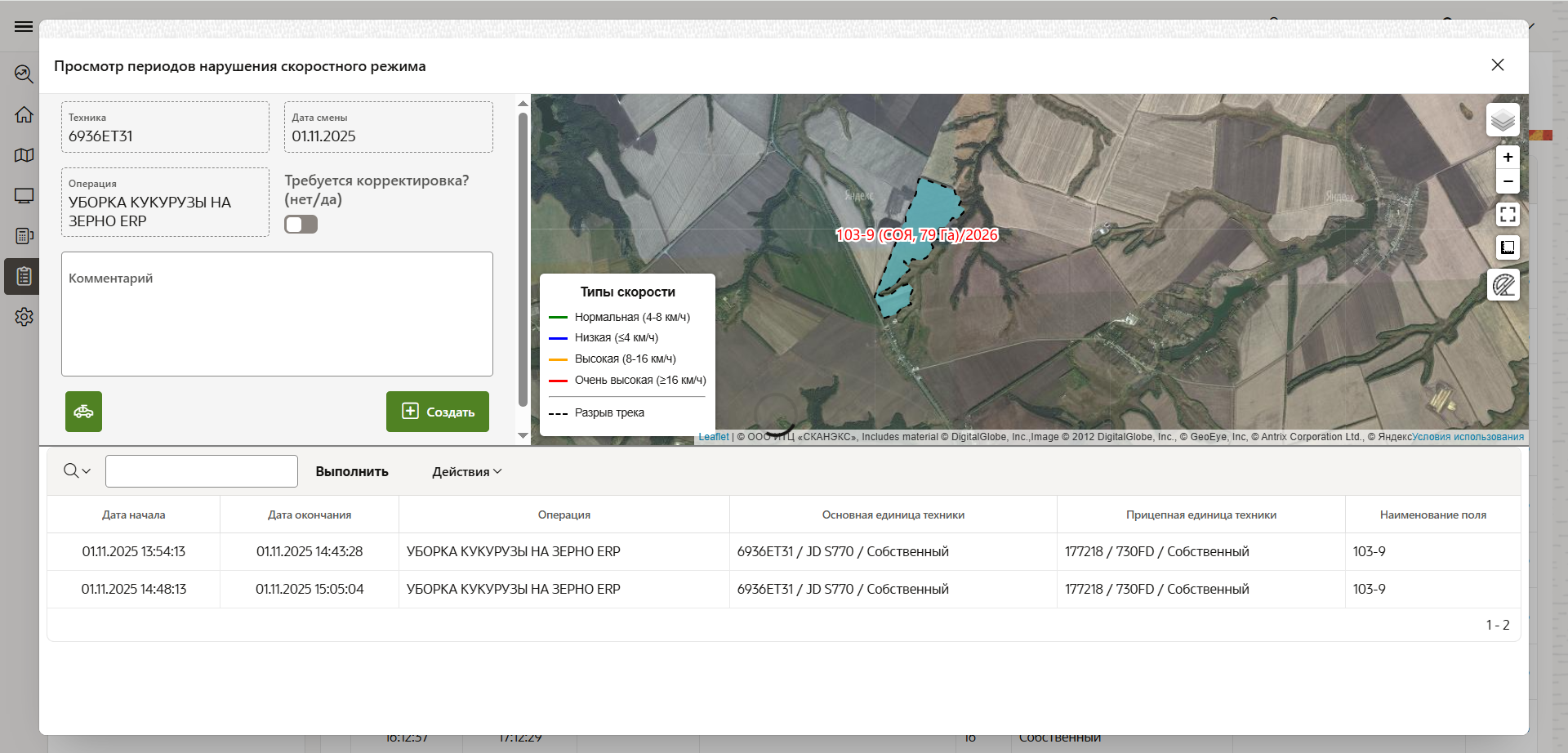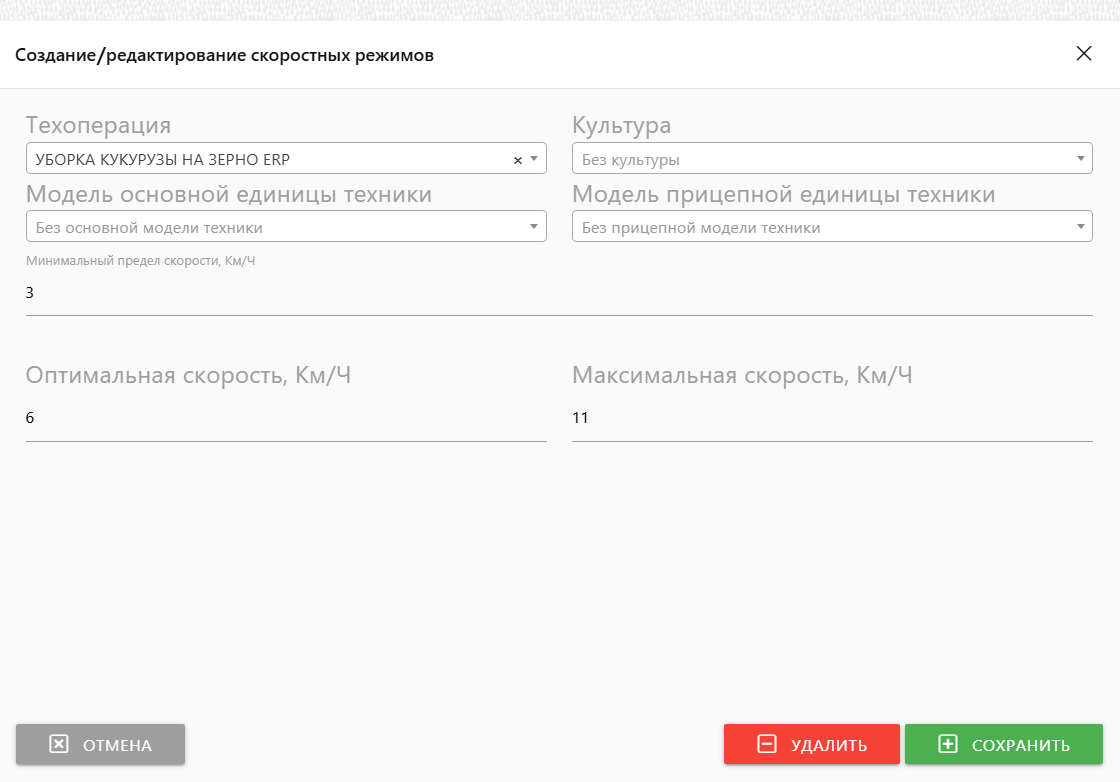 - Корректировка параметров скоростного режима применяется глобально ко всем записям данной технологической карты. При необходимости разных параметров для разных полей или дат создайте отдельные записи технологических карт.
