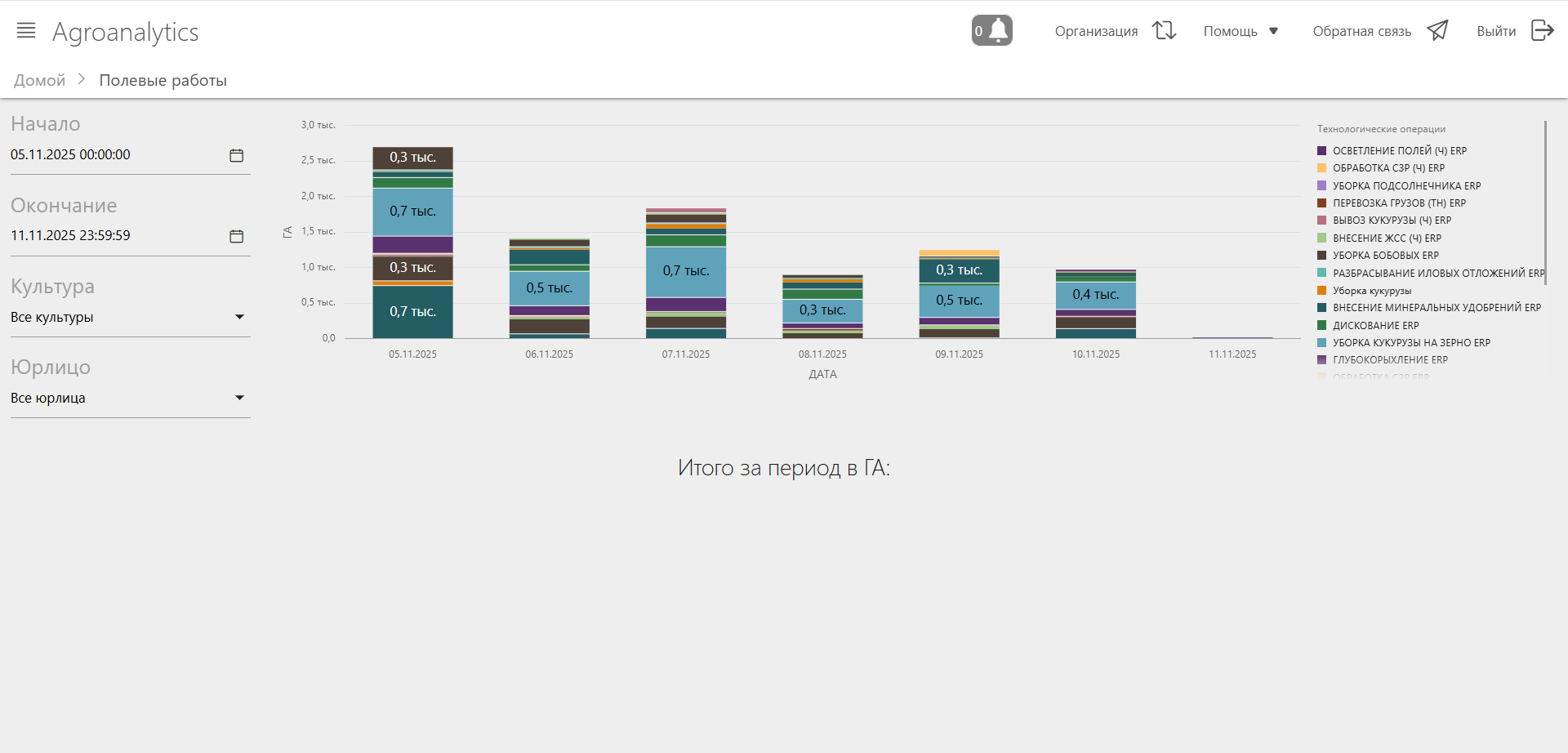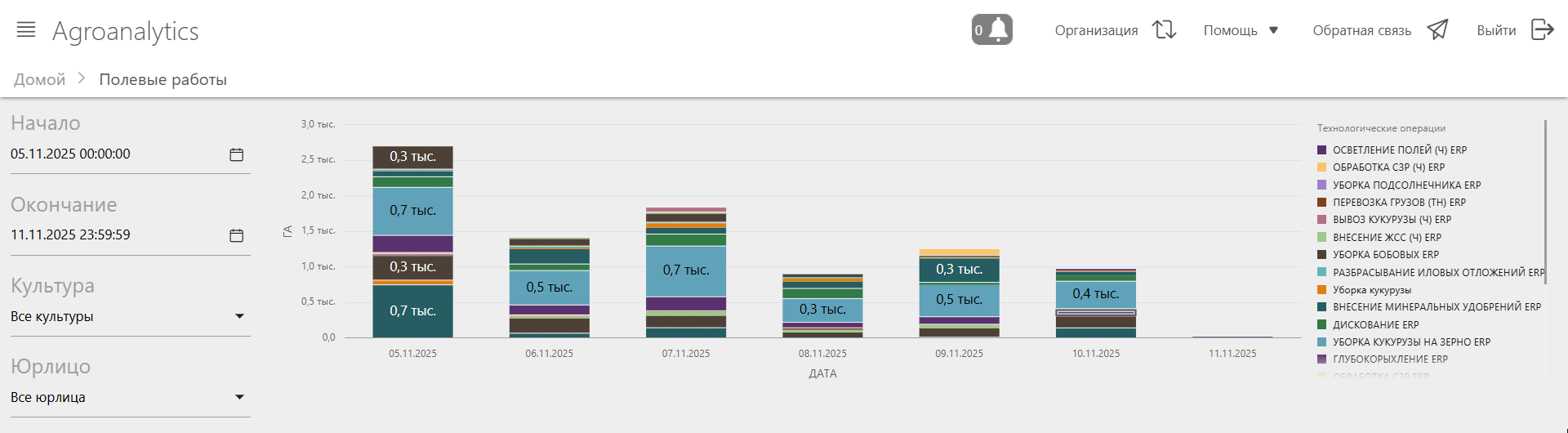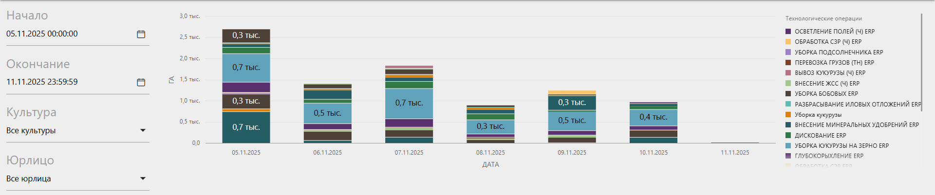 После выбора временного интервала можно дополнительно отфильтровать данные по культуре и/или юридическому лицу.