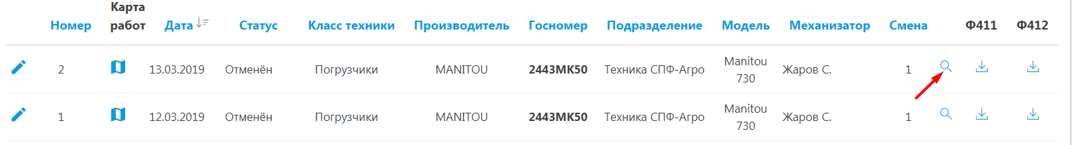 После этого для просмотра информации необходимо найти и открыть посевную операцию с помощью значка «Лупы»: