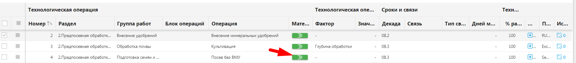 В блок попадают данные по тем операциям, для которых в технологической карте в графе «Раздел» указано «Предпосевная обработка почвы и сев»: