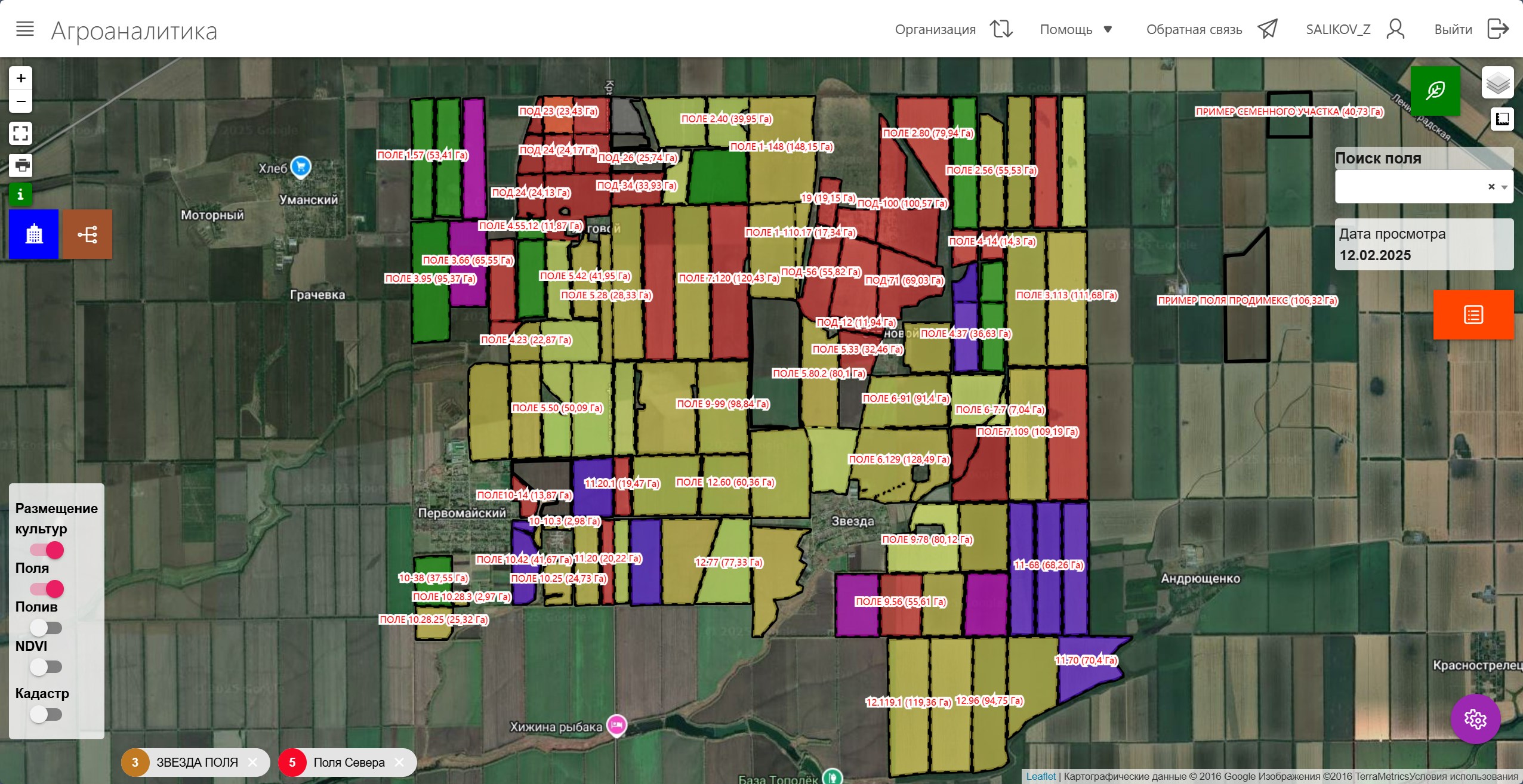 После выбора подразделений откроется карта с полями и различные возможности работы с ней.