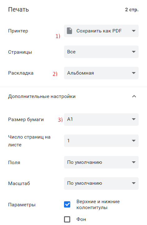 При нажатии кнопки есть возможность выбрать формат сохранения и тип печати карты: