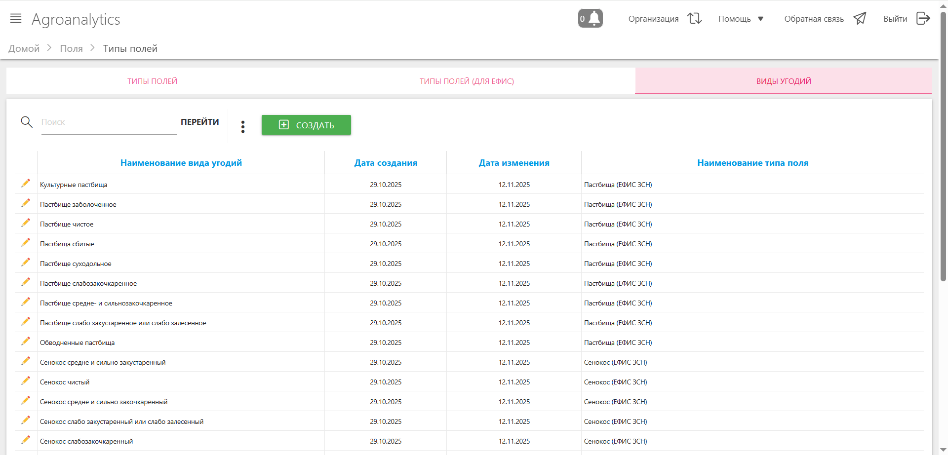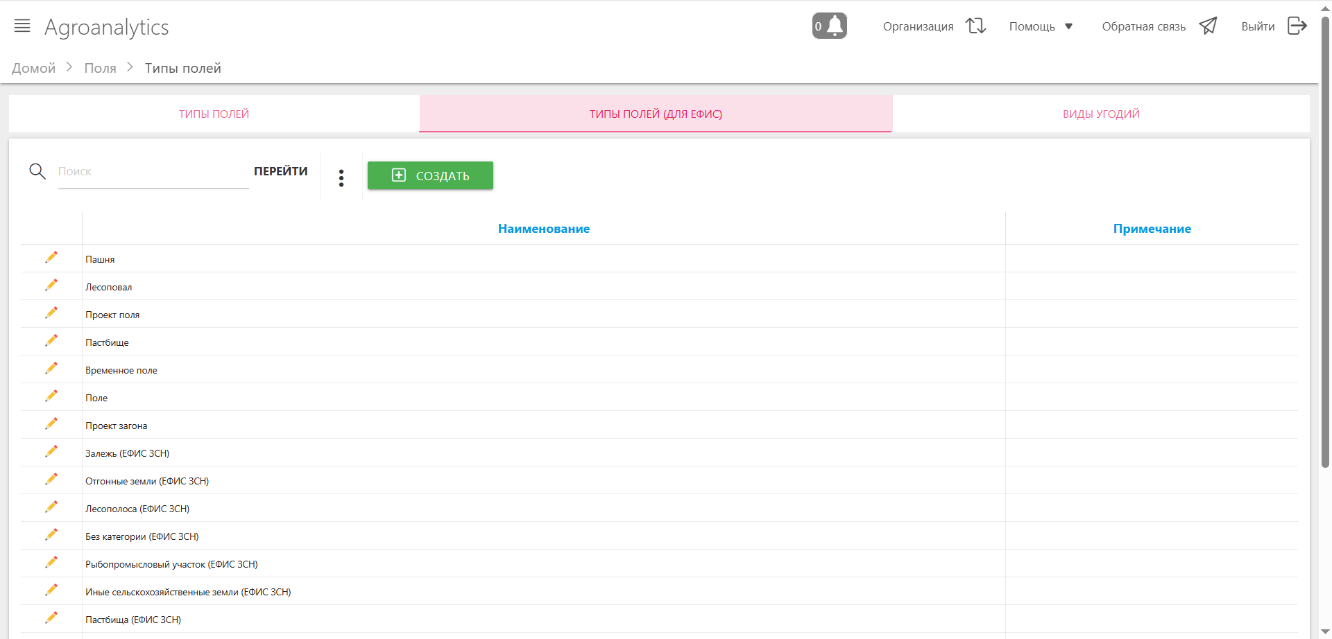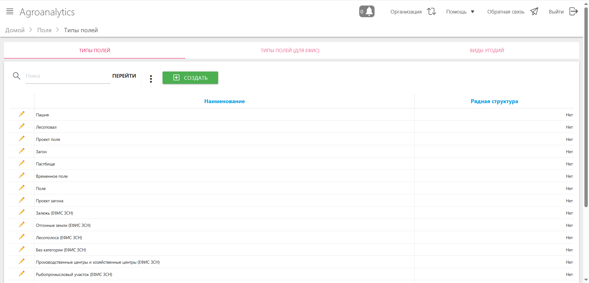 Модуль «Типы полей» предназначен для управления классификацией земельных угодий в системе SmartAgro через три независимых справочника. Модуль обеспечивает настройку внутренней классификации полей и их соответствие внешней системе ЕФИС ЗСН (Единая федеральная информационная система о землях сельскохозяйственного назначения).