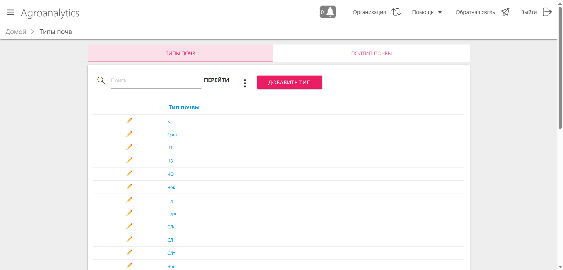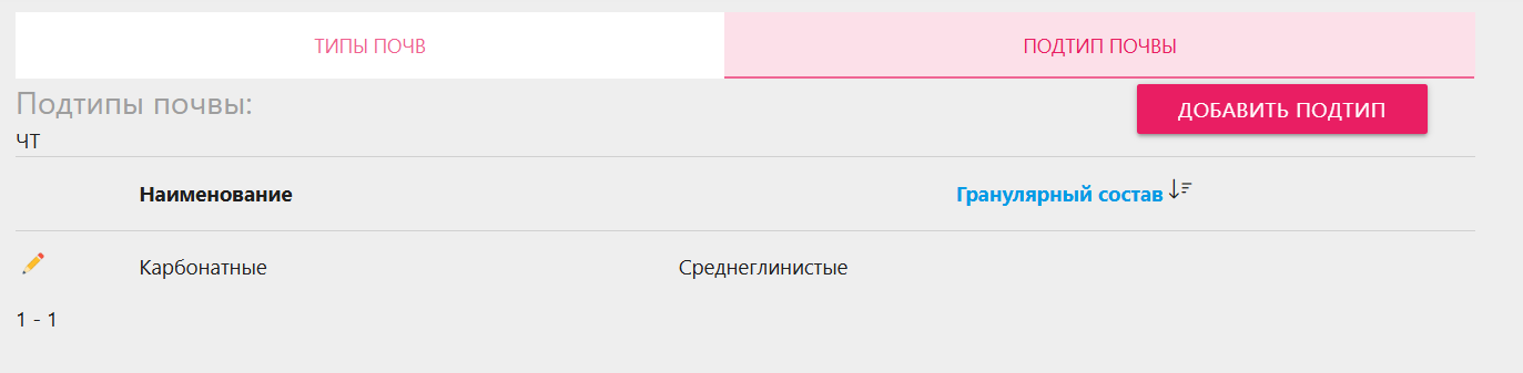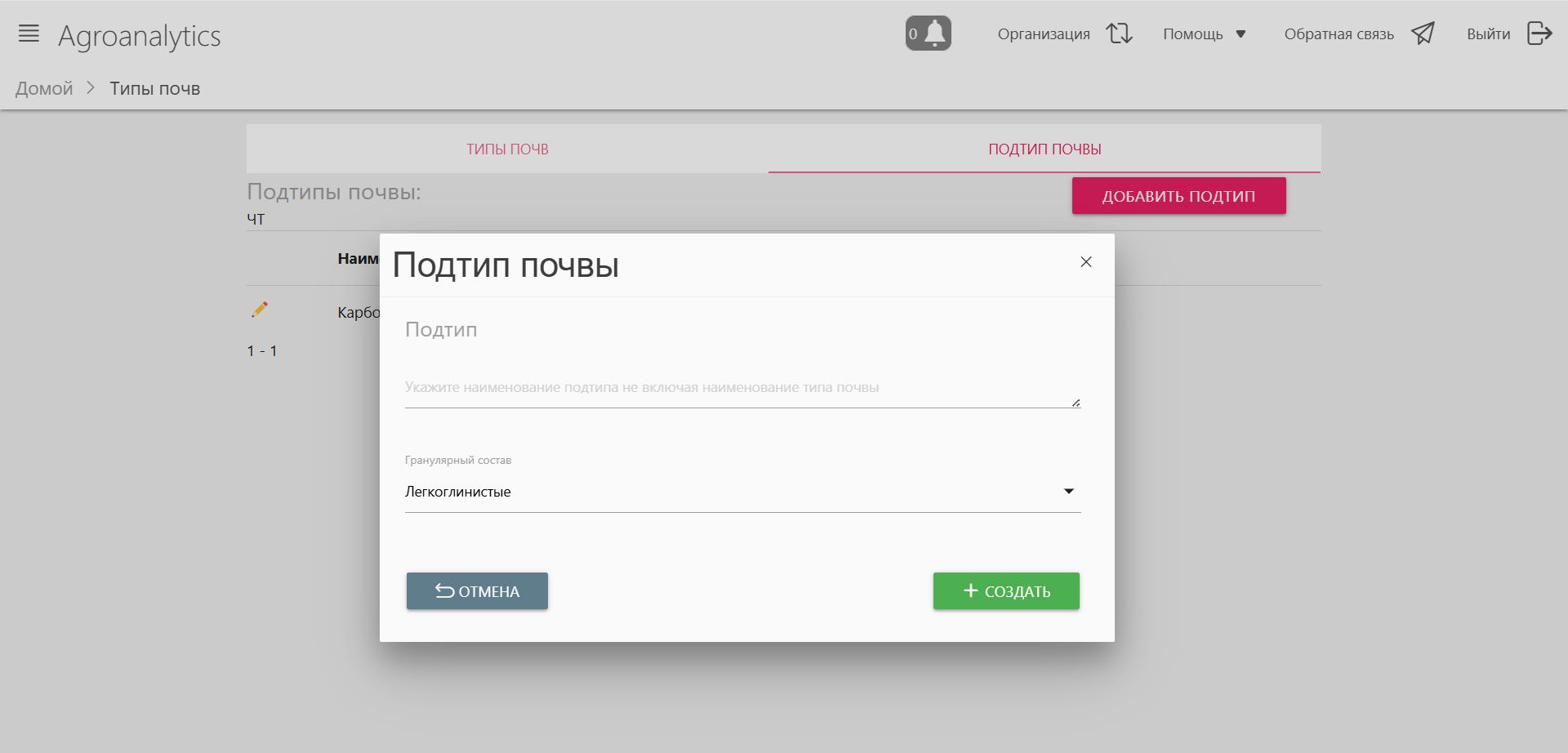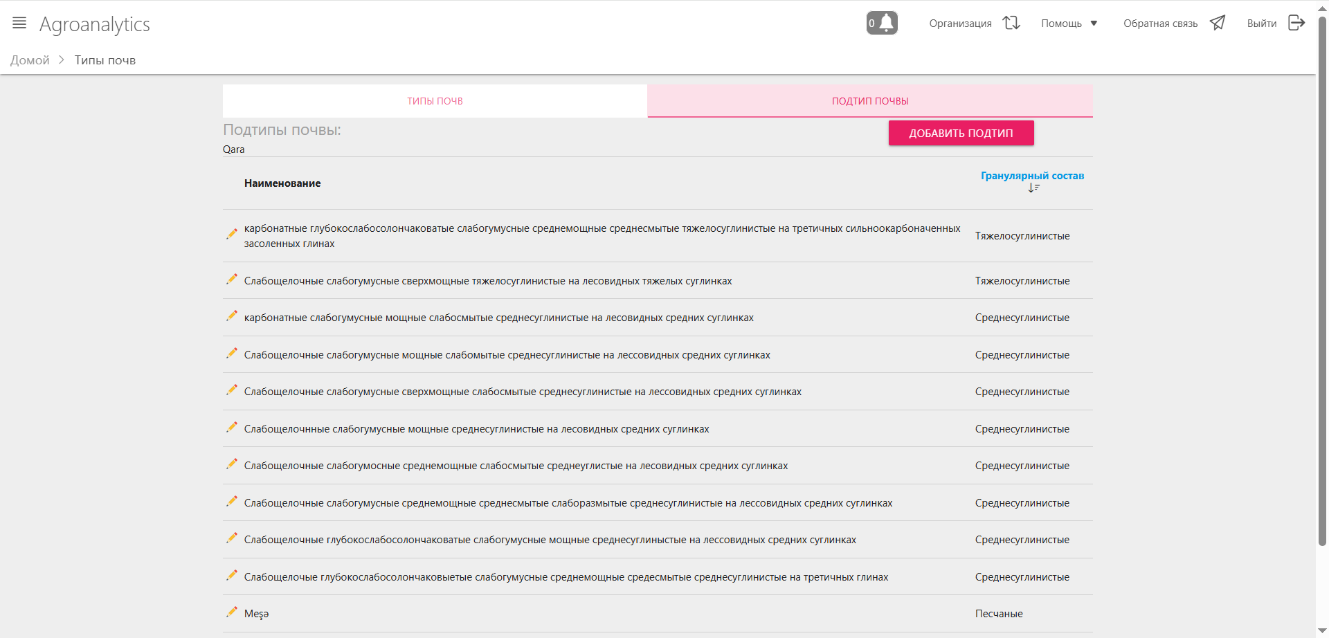 • Система откроет интерфейс управления подтипами для выбранного типа почвы