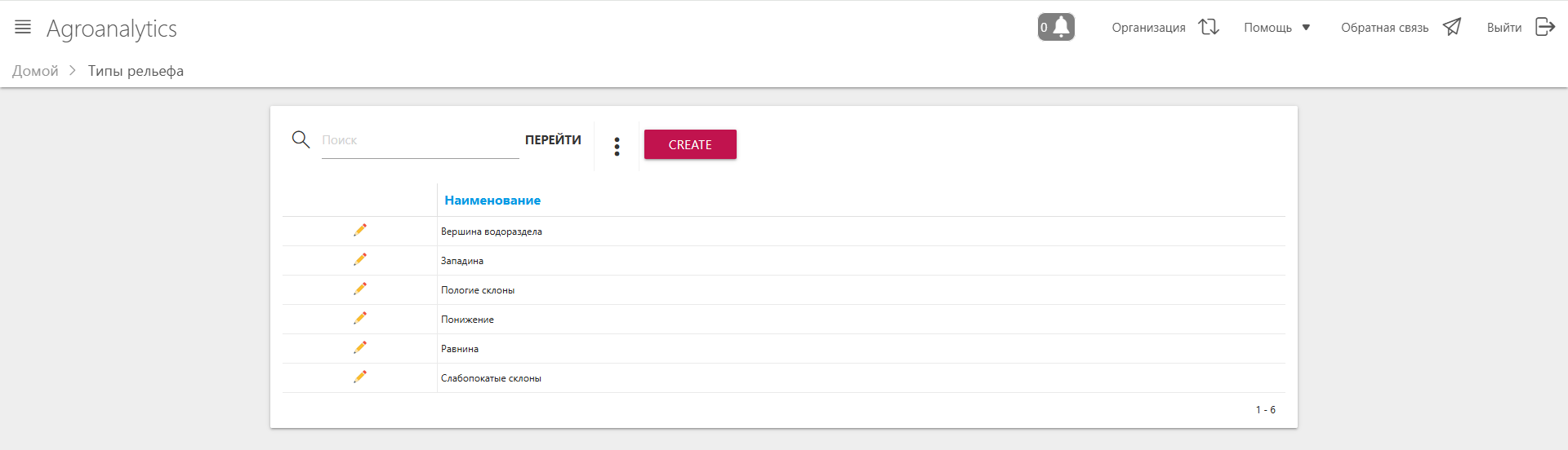 «Главное меню» → «Настройки» → «Справочники почв» → «Типы рельефа»