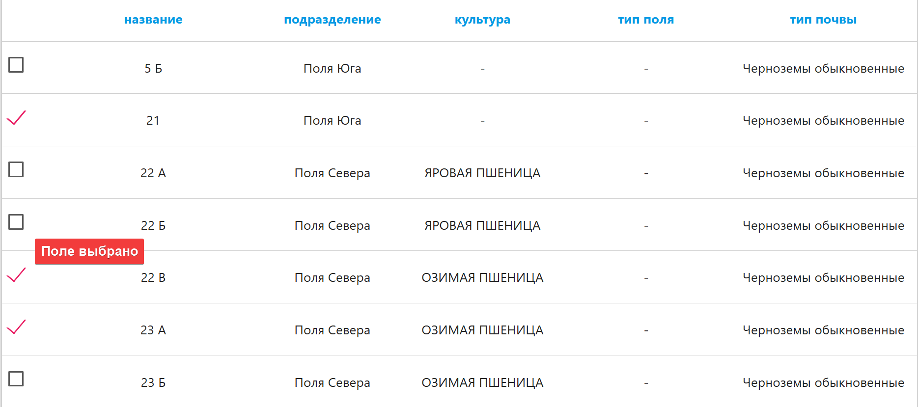 В системе можно применить фильтры по различным параметрам, таким как название поля, подразделение, культура на поле, тип поля или тип почвы.