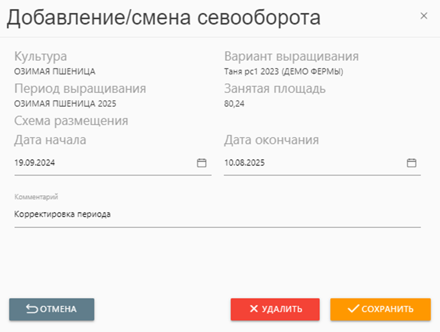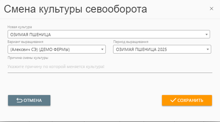 Если плановая культура не совпадает с фактически посаженной или изменилось назначение поля, можно внести изменения: