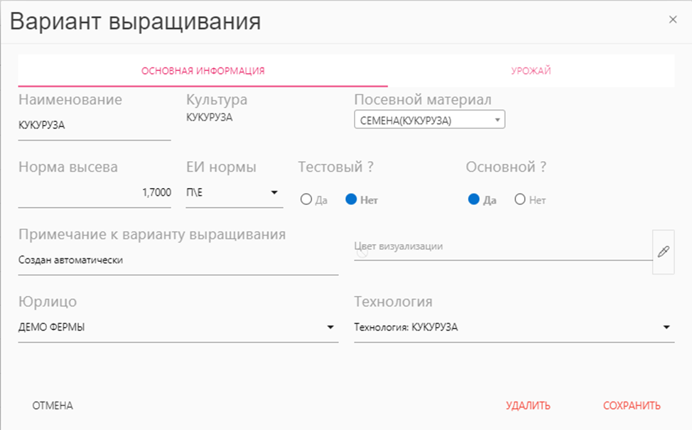 - Основной? — флаг, обозначающий основной вариант выращивания.