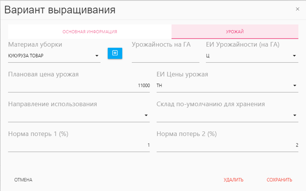 - Норма потерь 1 (%) — процент потерь на этапе уборки.