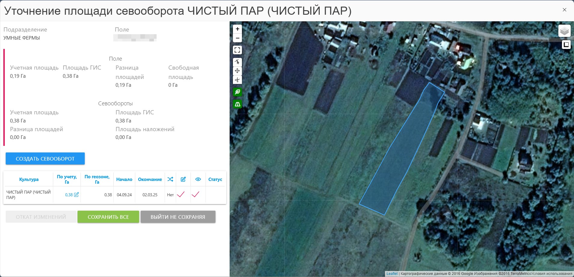 - Нажав на значение в столбце "В севообороте по учету", можно изменить учетную площадь.