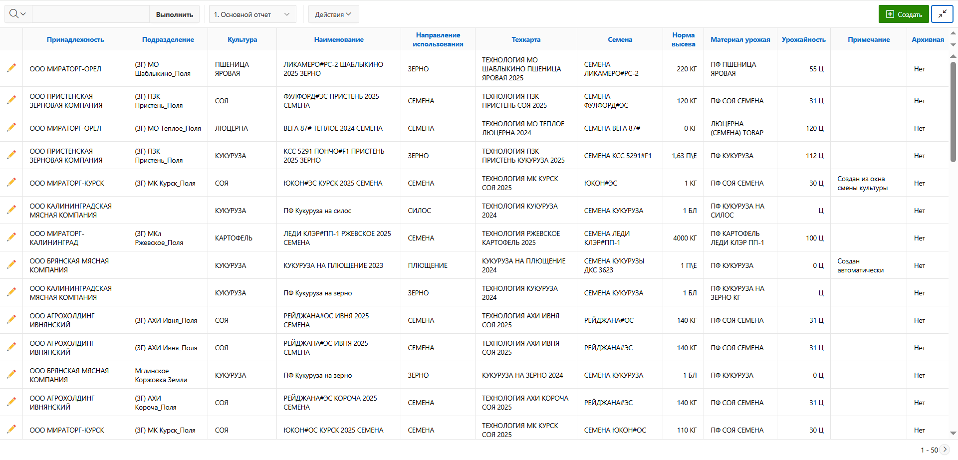 Модуль "Варианты выращивания" представляет собой справочник технологических карт, который позволяет создавать и управлять различными вариантами выращивания сельскохозяйственных культур с учетом специфики сортов, технологий и целевого использования урожая.