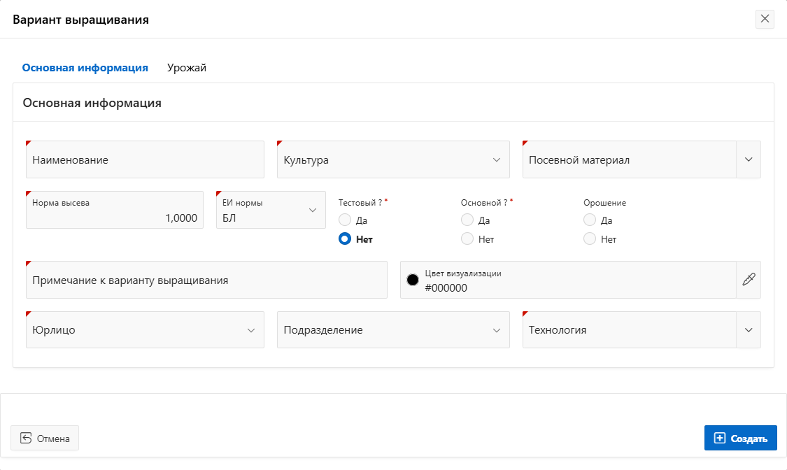 Рис. 3. Форма создания варианта выращивания - вкладка "Основная информация"