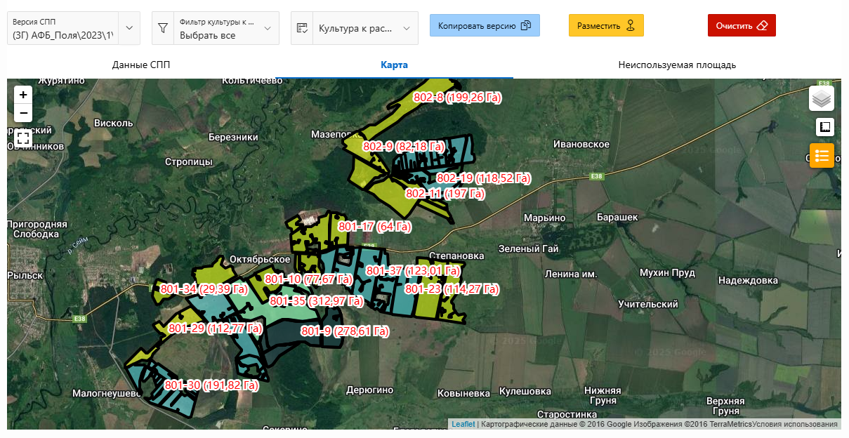 Очистка данных — кнопка «Очистить» полностью удаляет все распределения культур в текущей версии. Используйте эту функцию только в случае крайней необходимости, так как операция необратима.