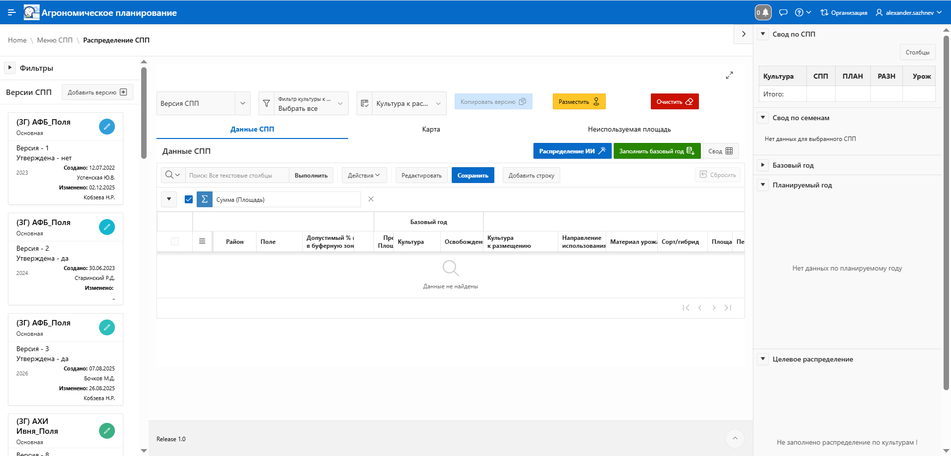 На панели отображается список всех созданных версий севооборотных планов.
