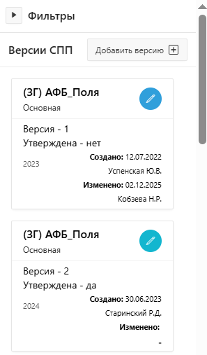 Список версий СПП — отображает все существующие версии с атрибутами: наименование, статус «Основная», номер версии, статус утверждения, год планирования, даты создания и изменения, авторы