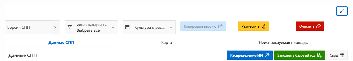 Различие интерфейса для утверждённых и неутверждённых версий — для утверждённых версий большинство элементов управления (редактирование, распределение ИИ, создание севооборотов, кнопки «Разместить» и «Очистить») заблокированы или отсутствуют. Для внесения изменений в утверждённую версию необходимо снять утверждение через панель версий СПП.