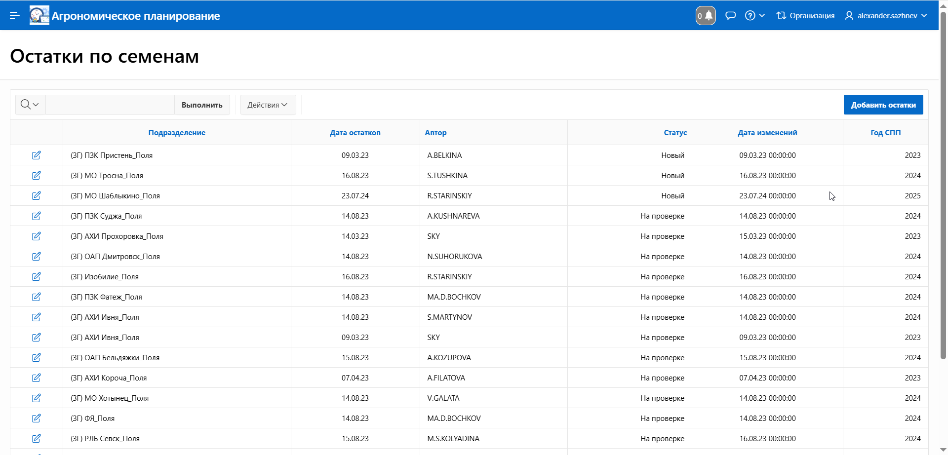 - «Главное меню» → «Севооборот» → «Планирование СПП» → «Остатки по семенам»