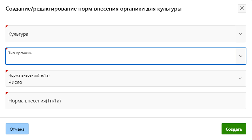 Рис. 5. Форма создания/редактирования нормы внесения органики.