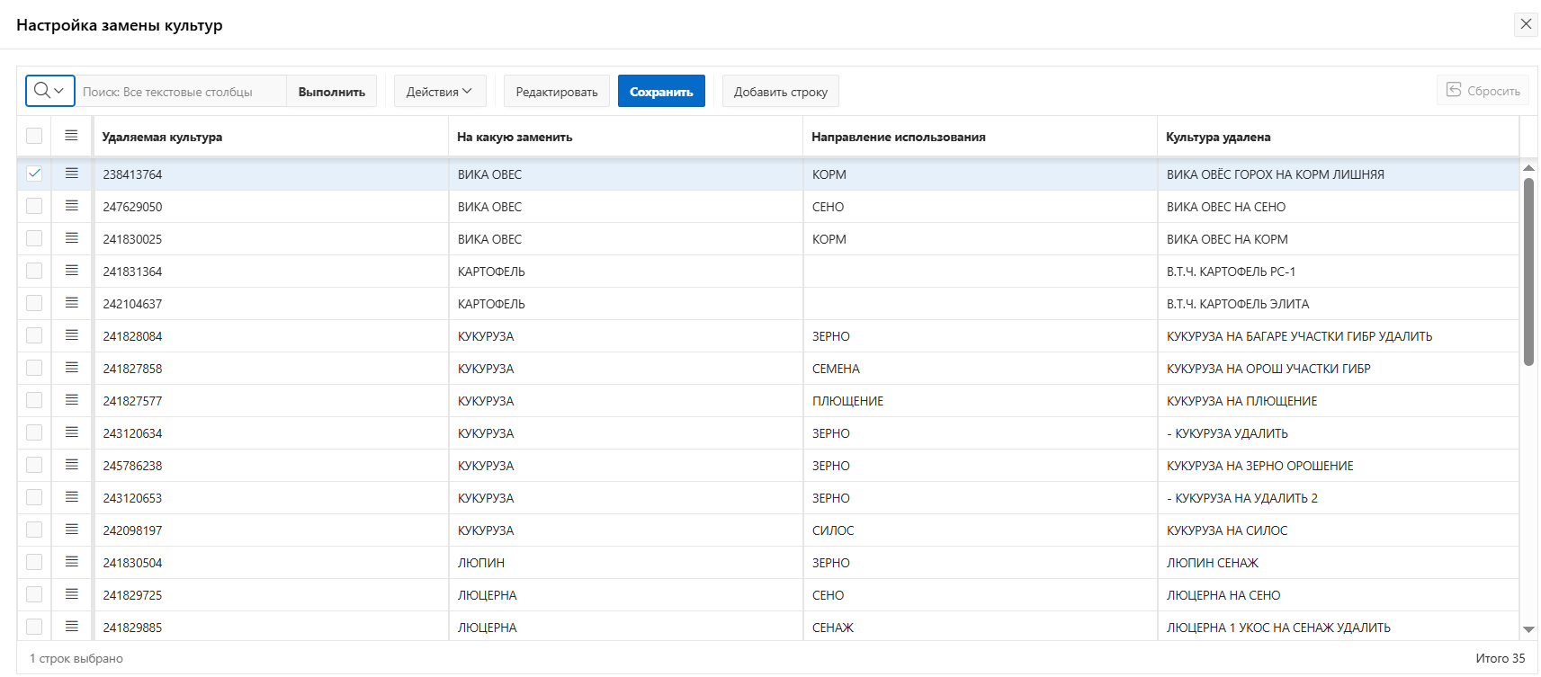 • Удаляемая культура — Поле для выбора. Здесь пользователь выбирает из списка наименование культуры/записи, которую нужно заменить.