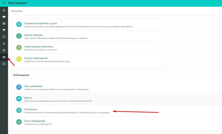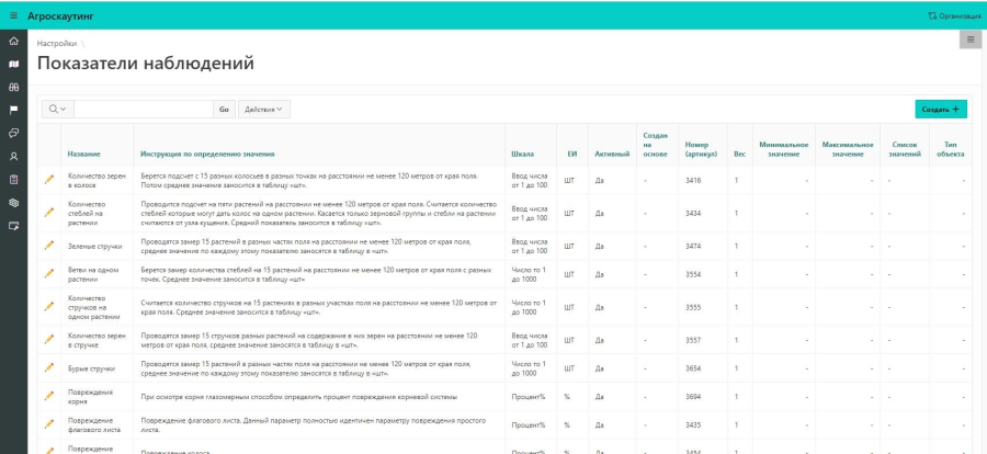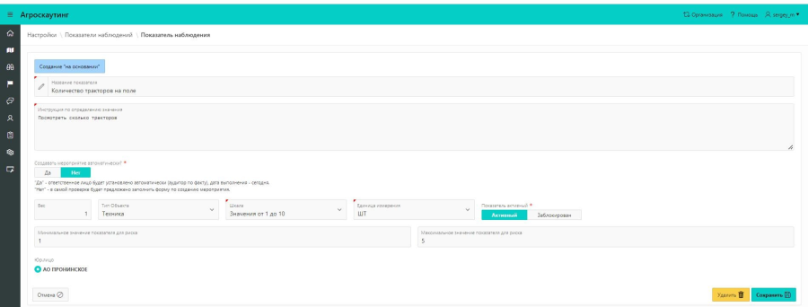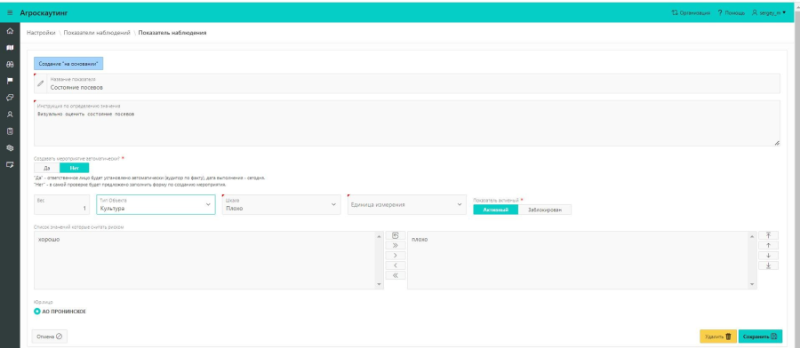 Тип объекта наблюдения: культура, техника, работа. В шаблоне наблюдений показатели будут доступны в зависимости от выбранного типа.