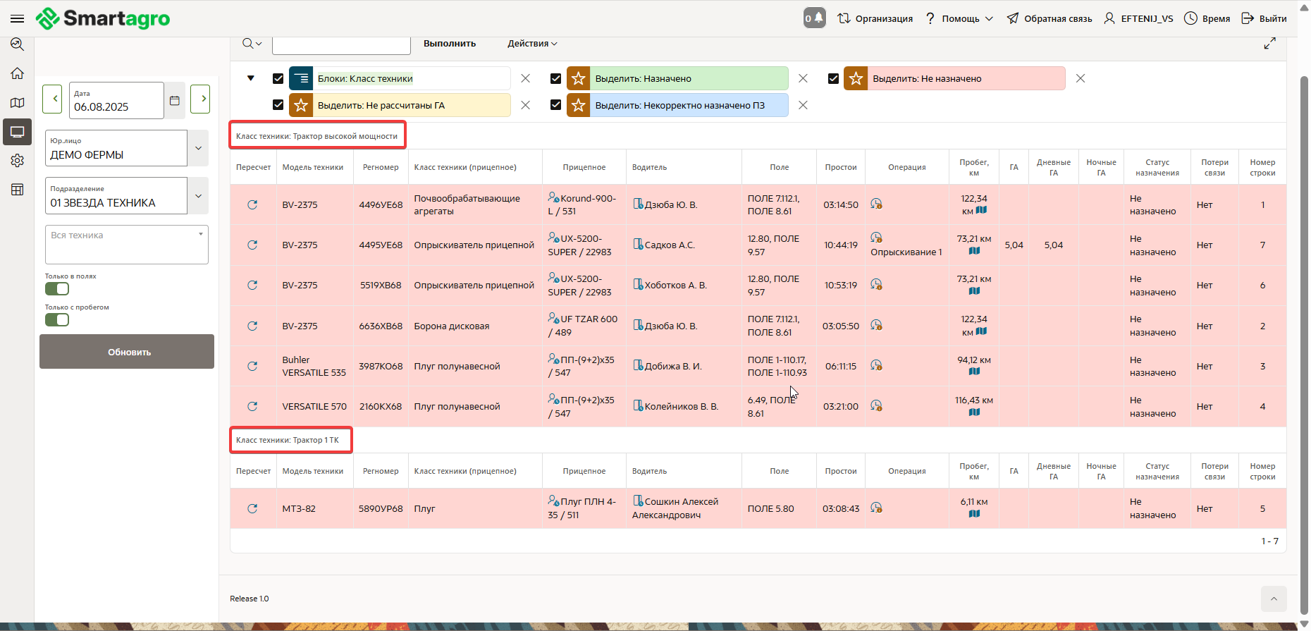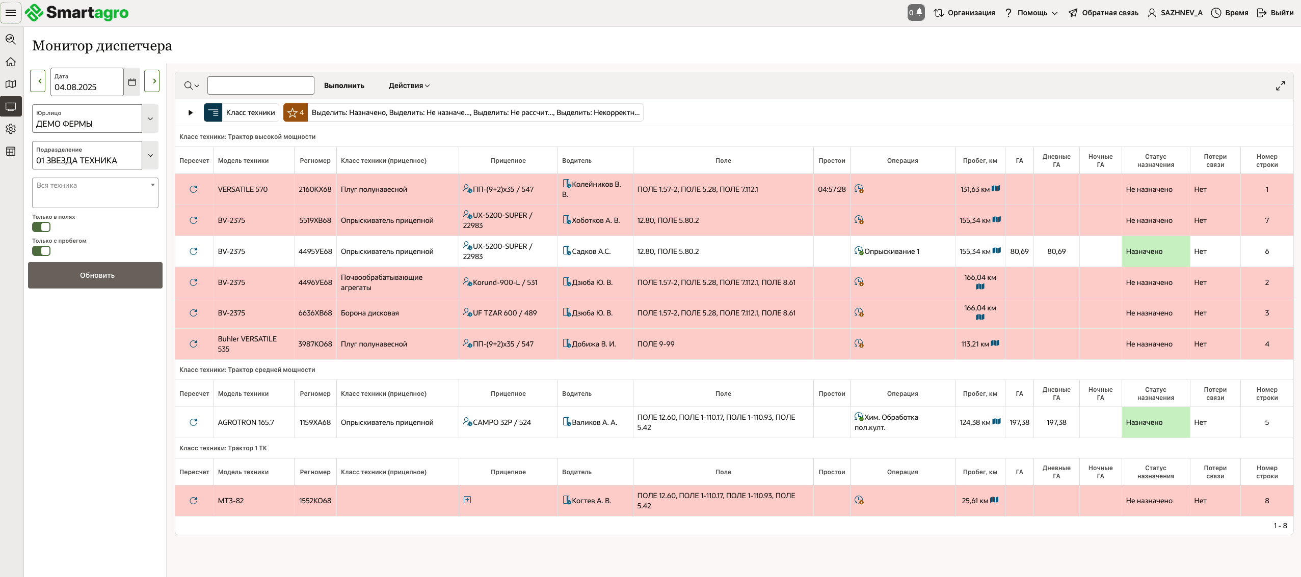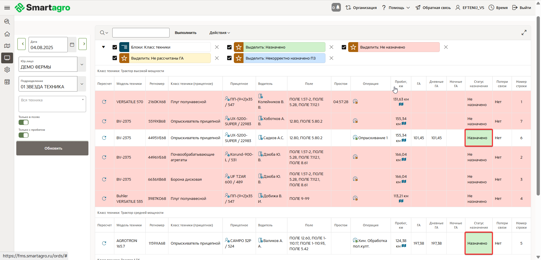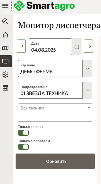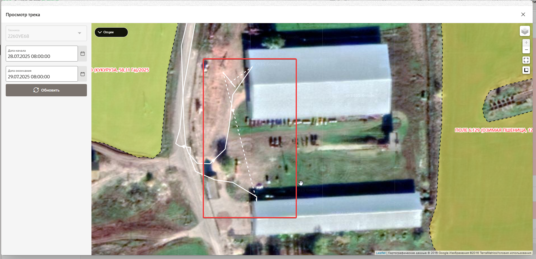2. В полях - показывает только ту технику, у которой есть трек и которая работала в полях