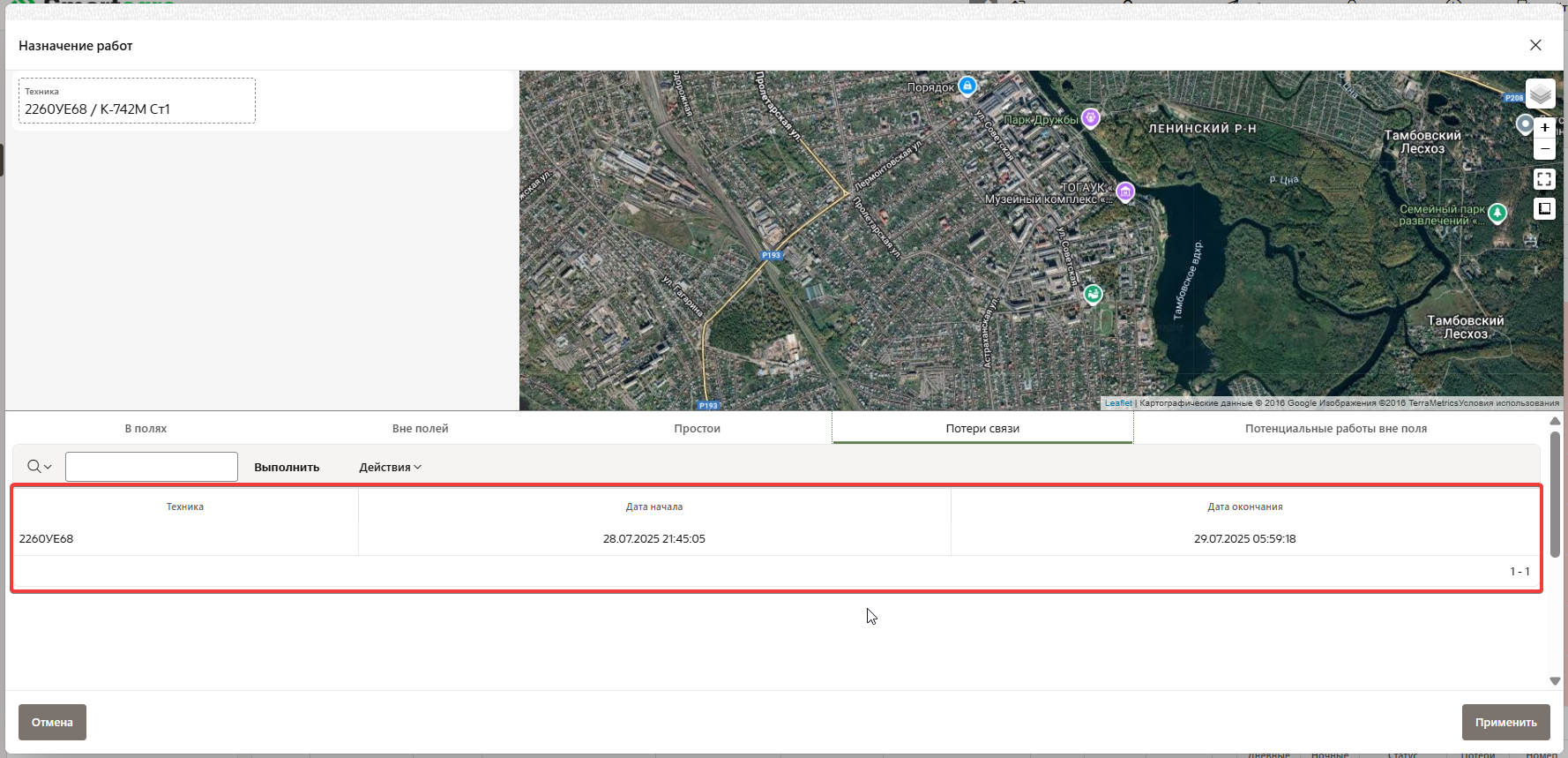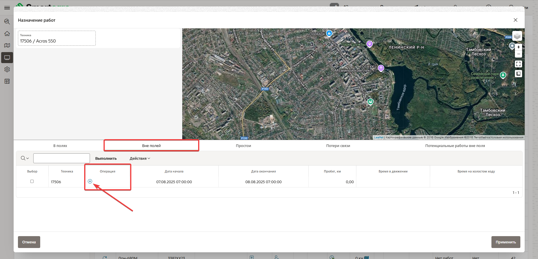 Для того, чтобы детально просмотреть операции, работы в полях, работы вне полей, простои, потери связи, потенциальные работы вне полей, необходимо перейти к столбцу "Операция" и нажать на часы . Таким образом появится окно "Назначение работ", на стартовой вкладке "В полях".