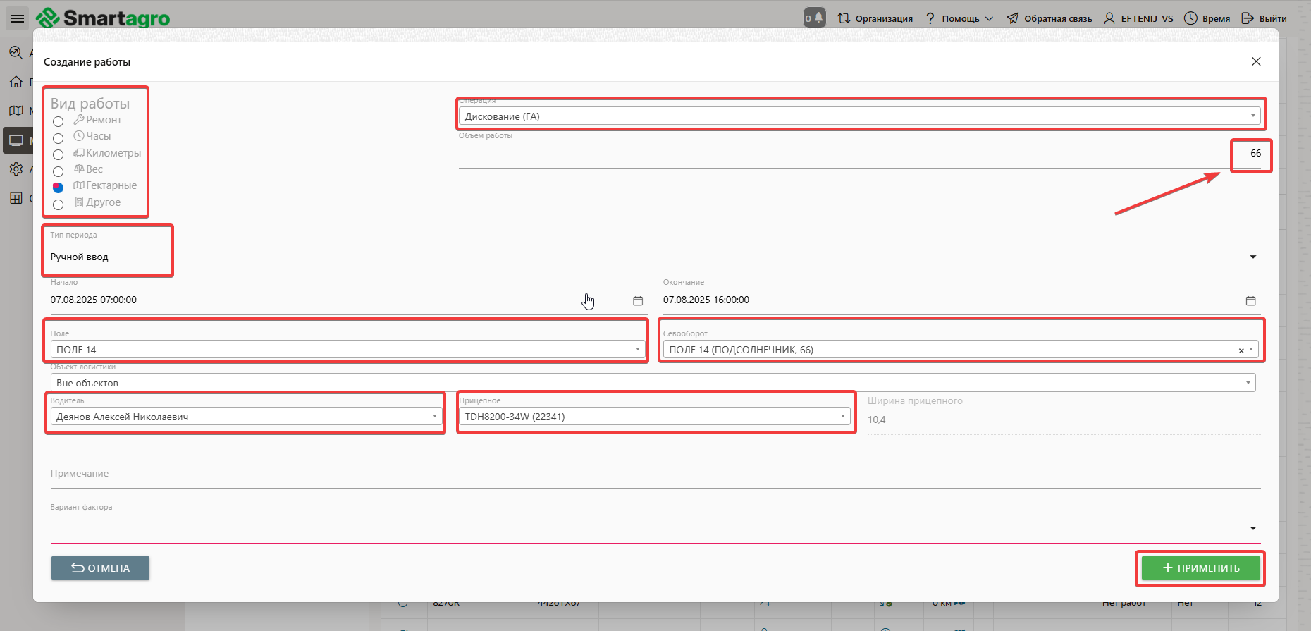 Работы назначаются аналогично тому, как описано в пункте выше: Назначение работ в полях с треком.