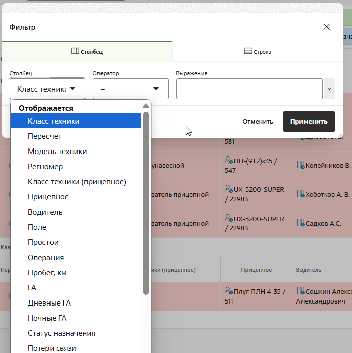 2. Прицепное - в данном столбце выполняется назначение Прицепного оборудования