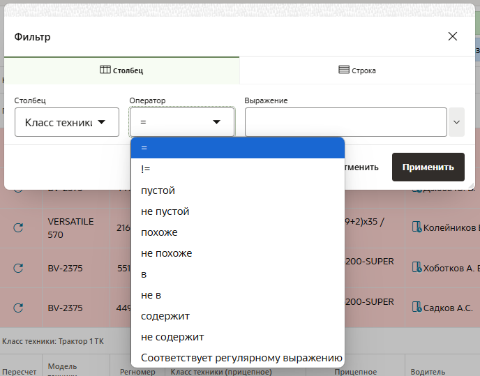 1.  = - в выбранном столбце будет производиться точный поиск по заданному "выражению". Учитывается регистр и полное название