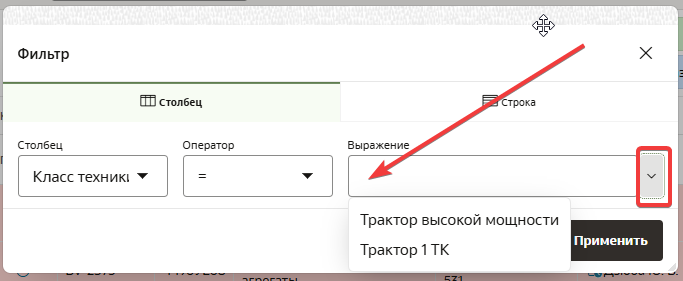 В поле "Выражение" есть возможность ввести значение самостоятельно, либо выбрать выражение из списка. Для отображения списка необходимо кликнуть по кнопке расположенной справа от поля "Выражения". Завершающим этапом будет нажатие по кнопке применить: