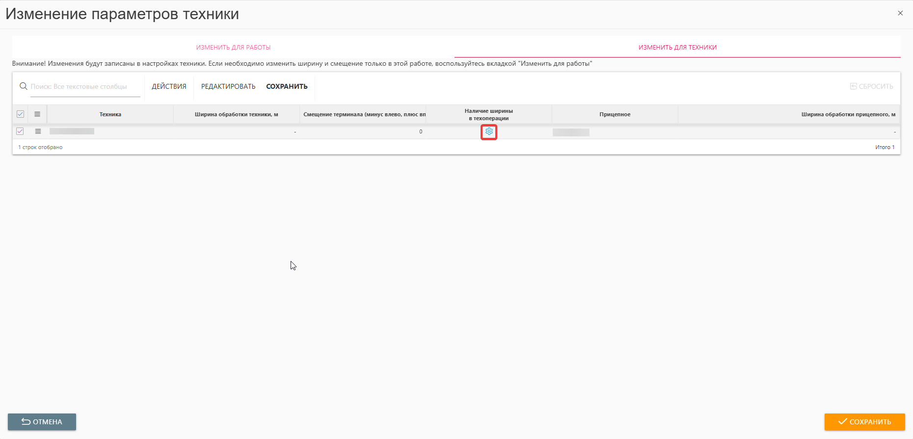 Позволяет изменить параметры техники только для текущей работы.