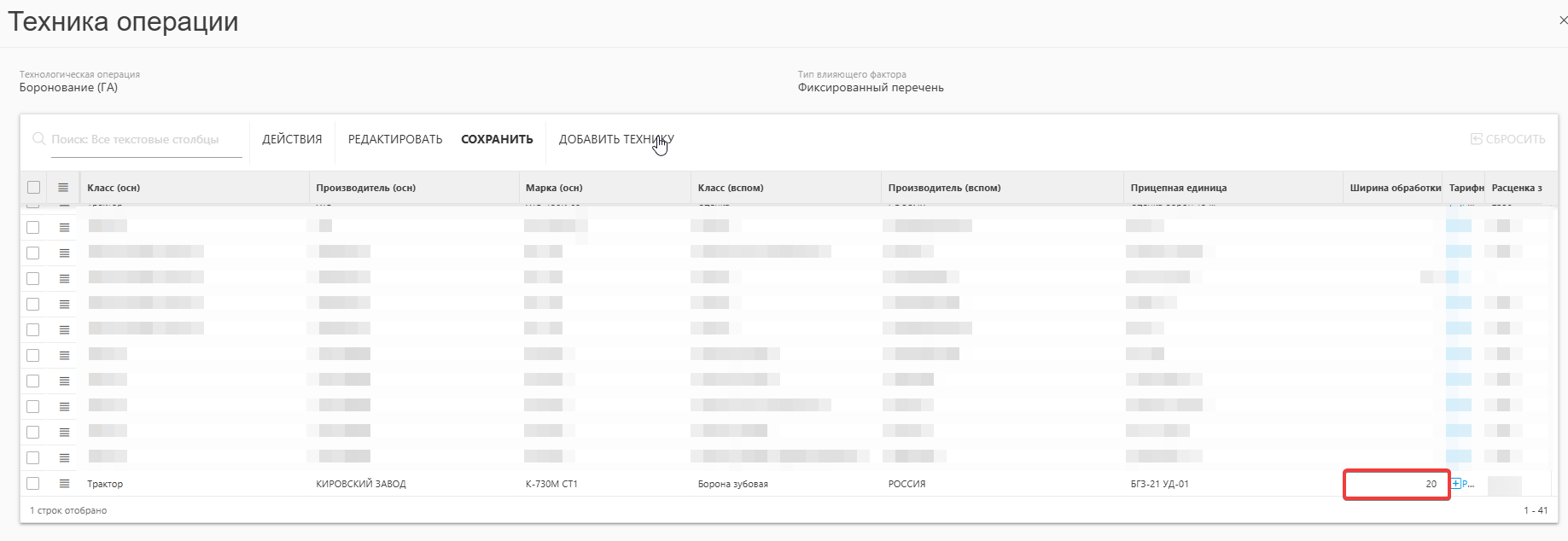 - Ширина обработки техники, м - устанавливается для самой техники, если она самоходная и без прицепного