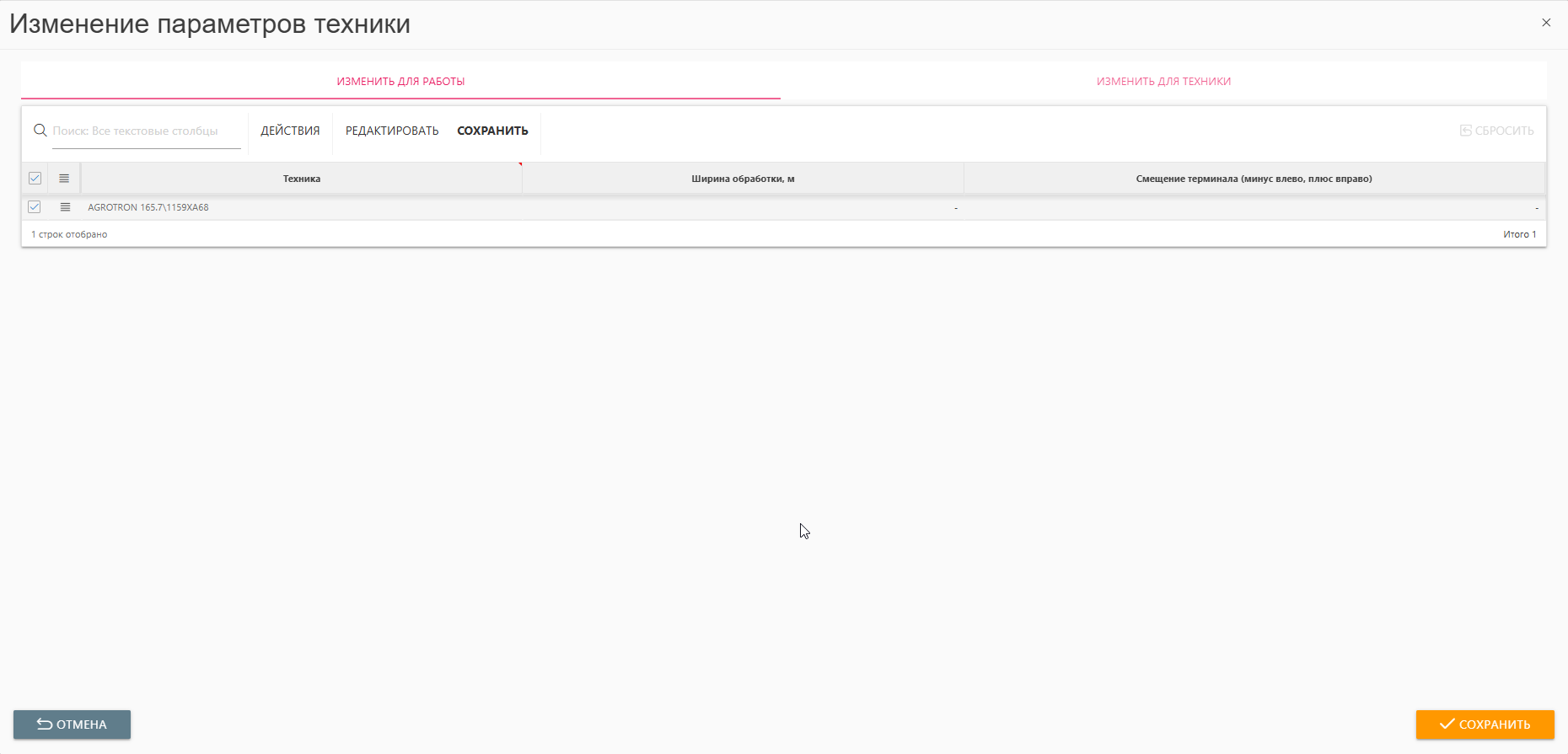 Если изменения нужны только для одной работы, следует использовать вкладку "Изменить для работы", иначе настройки техники изменятся для всех будущих работ.