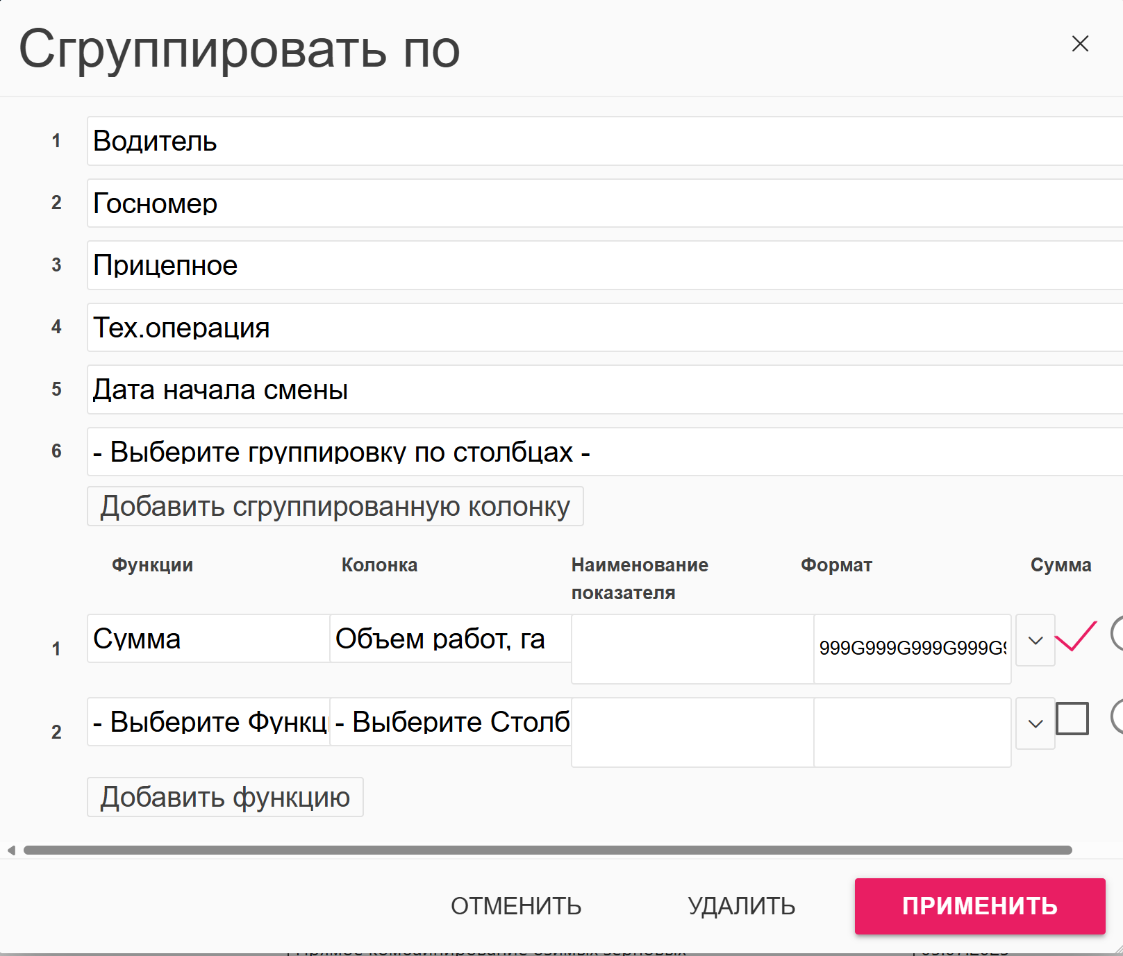 Формирование функции выглядит похожим образом, сначала выбираем функцию, а потом столбец, над которым будет выполняться операция. Также можно добавить несколько столбцов с функциями.