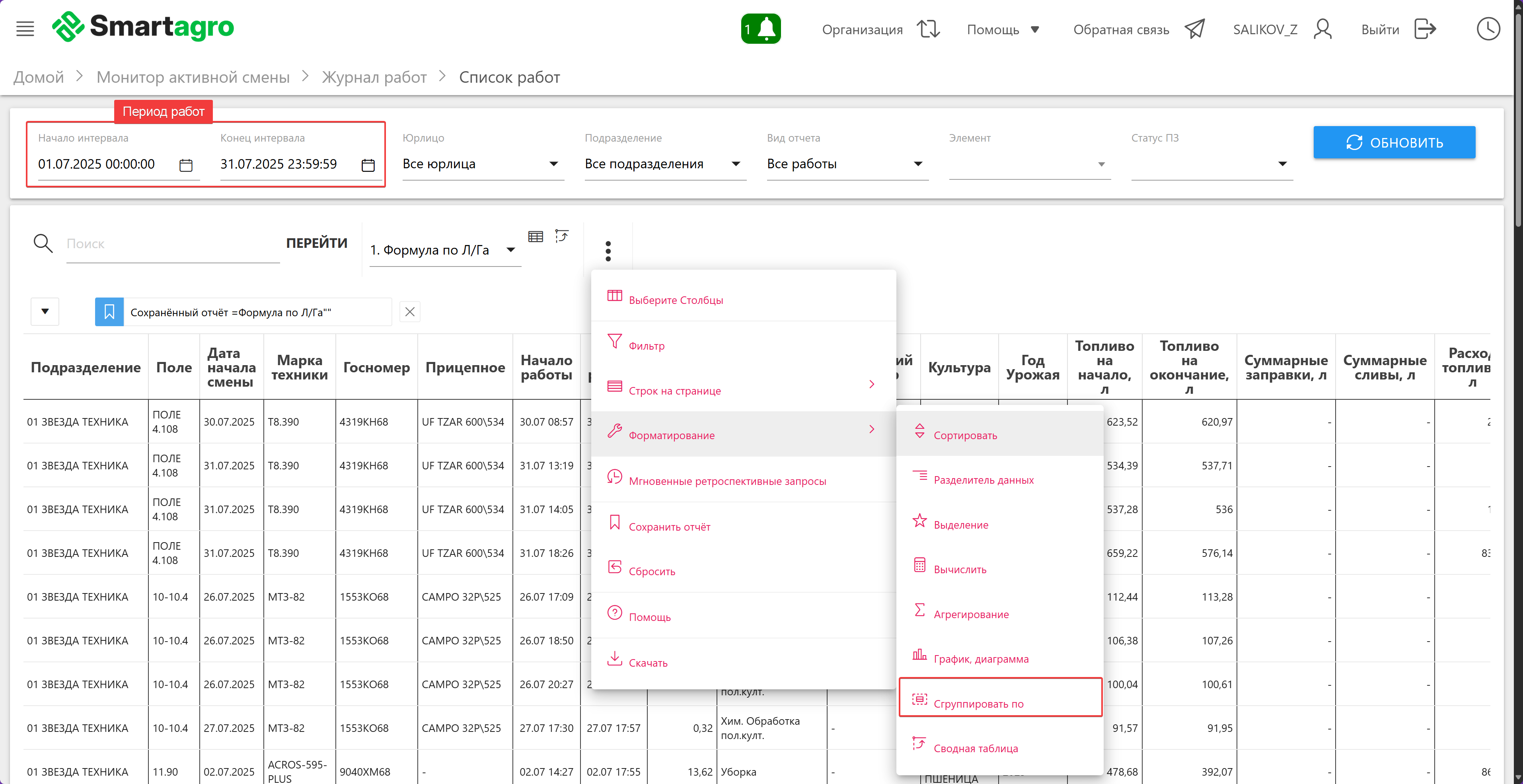 Для этого необходимо перейти в Меню → Управление работами → Журнал работ - для формирования отчета по гектарным работам. Или перейти в Меню → Управление работами → Журнал негектарных работ - для формирования отчета по негектарным работам(часовые, весовые).