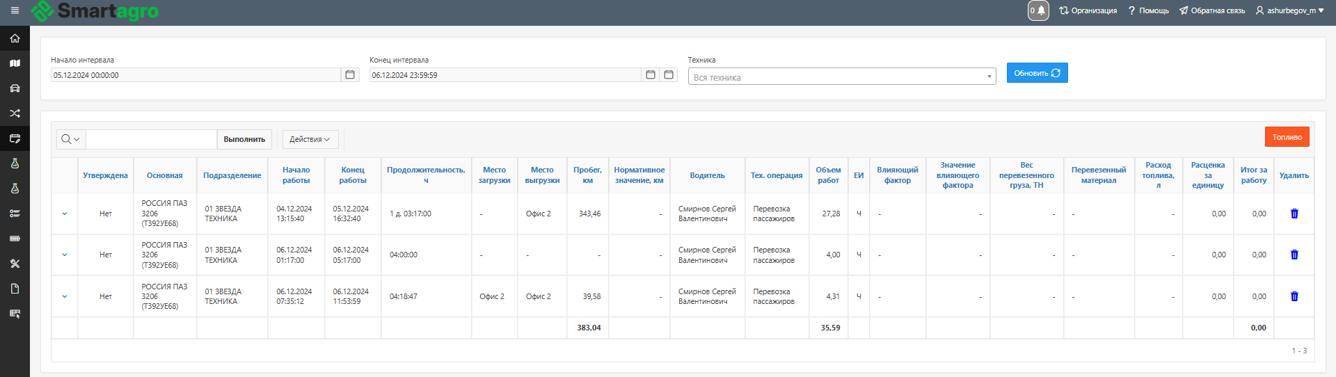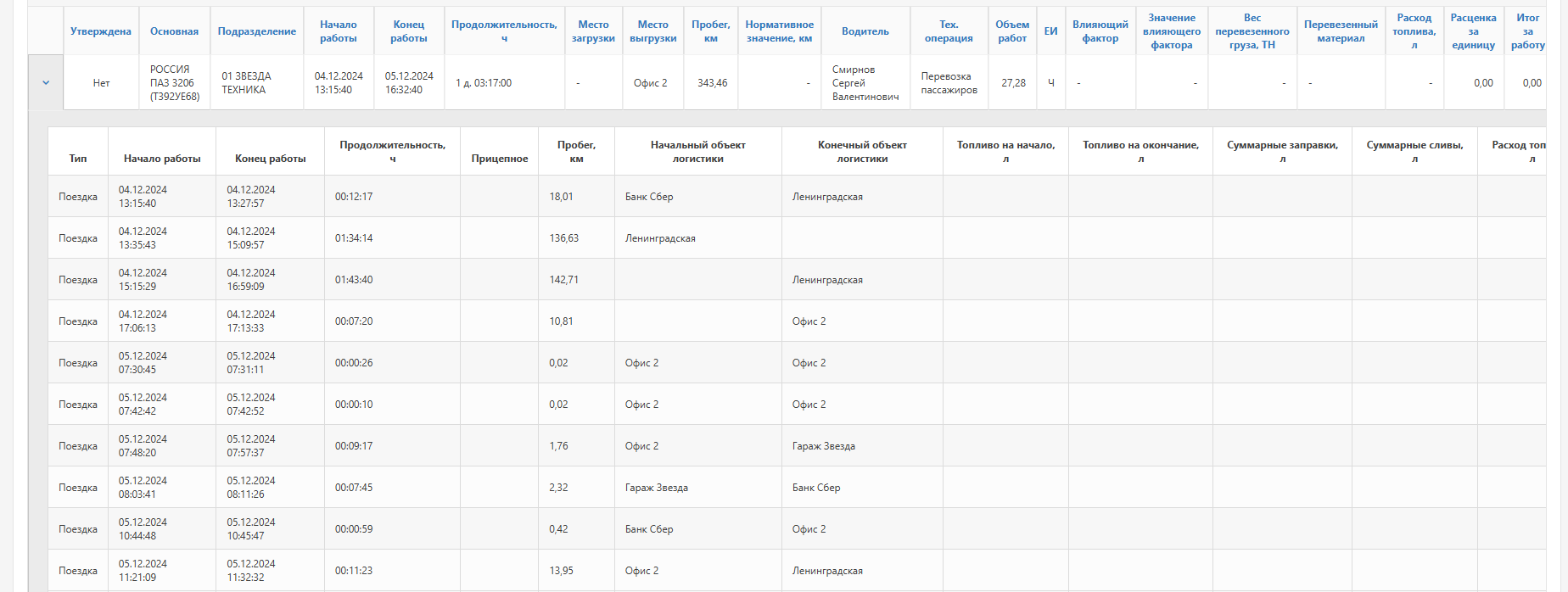 | Расход топлива, л | Отображает расход топлива на проведённую транспортную работу (если такой не указан, то стоит прочерк ( - )) |