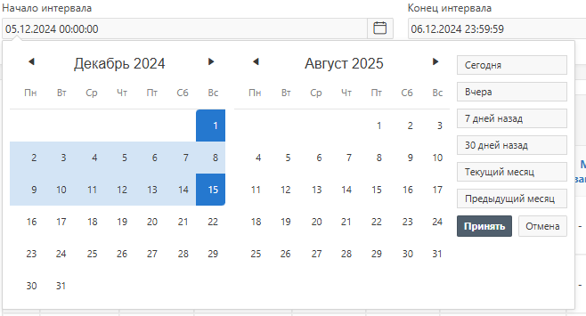 Начало интервала и конец интервала - Дата и время, в диапазоне которых мы хотим посмотреть записи о работах. Можно ввести вручную, а можно выбрать в календаре сразу и начало и конец интервала. (Рис. 3)