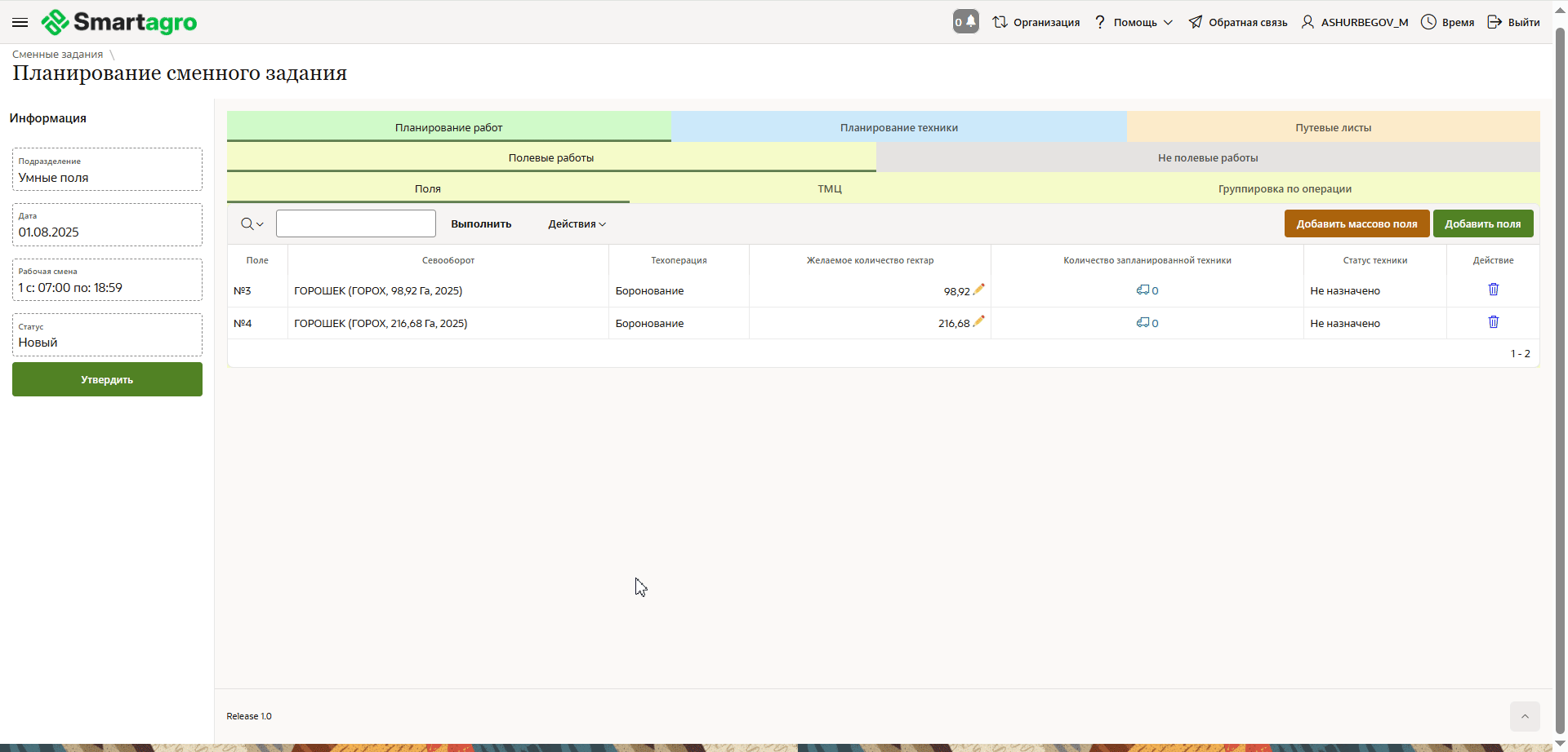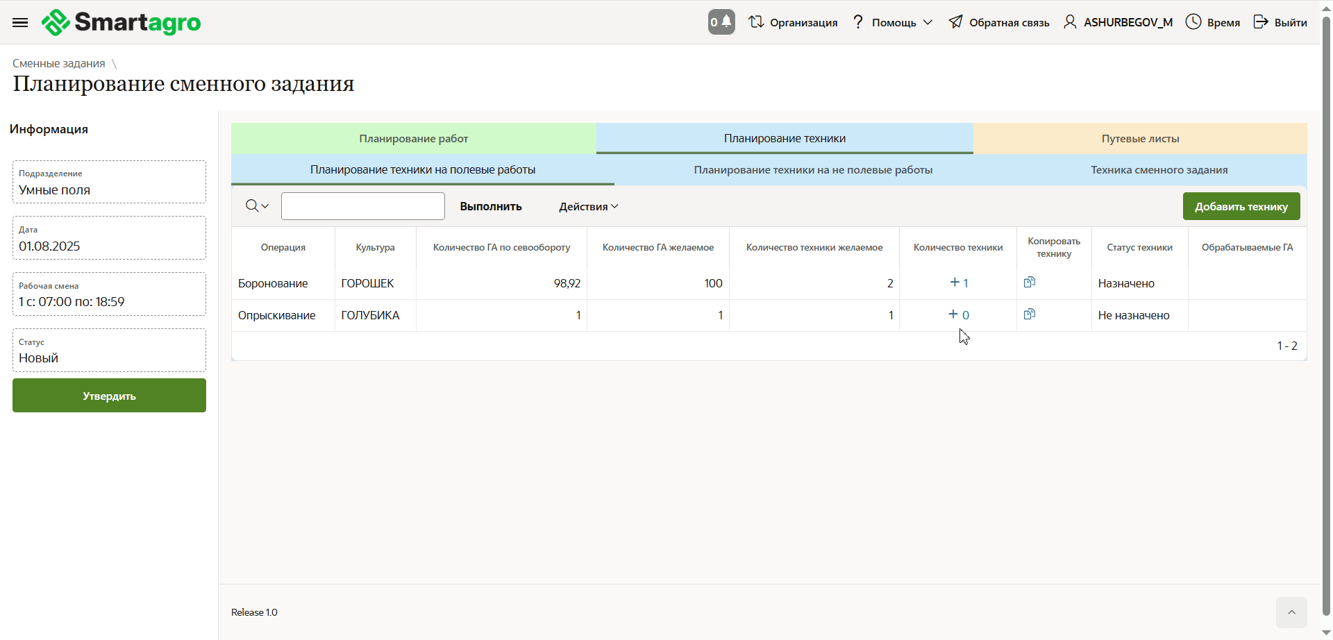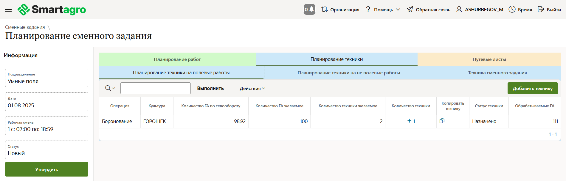 - Количество техники — Фактическое количество назначенной на полевую работу техники