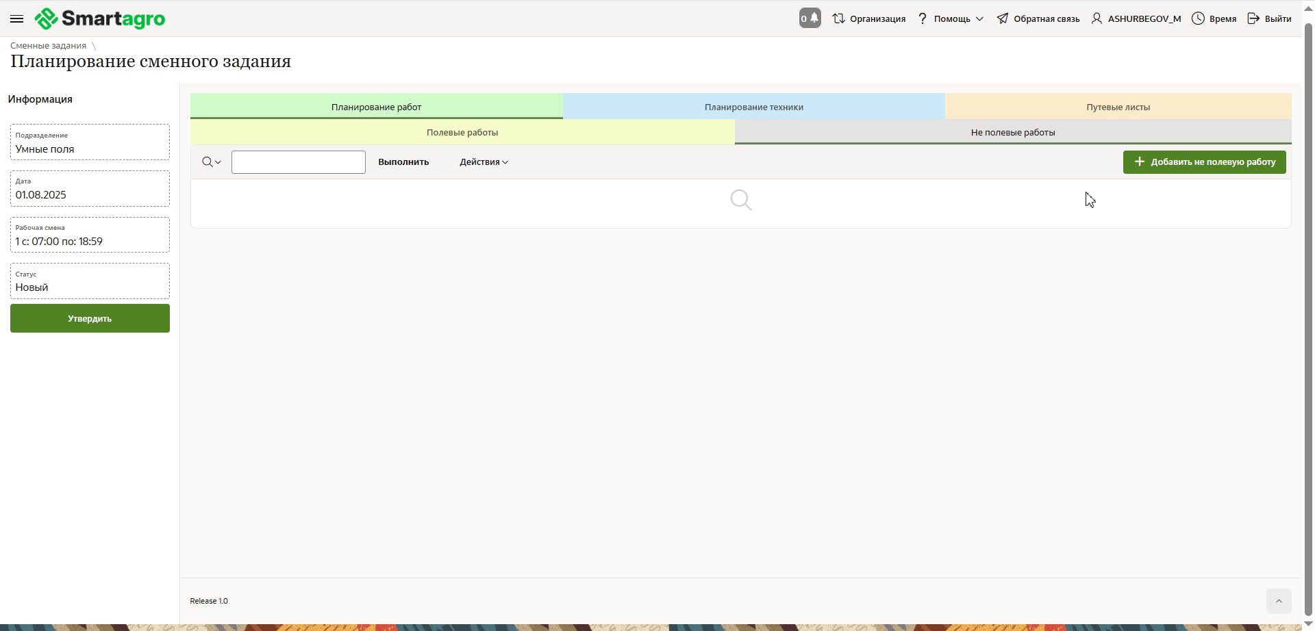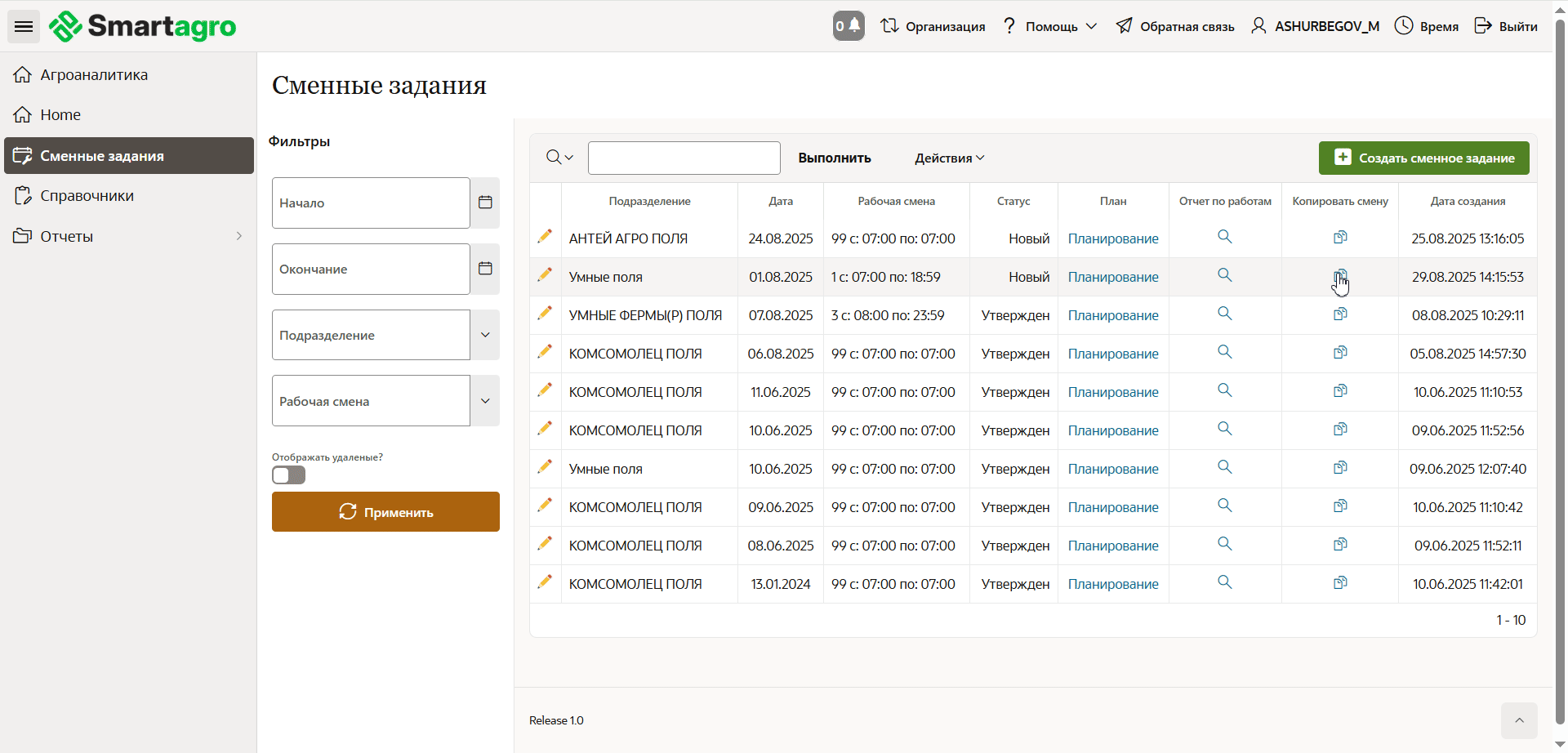 - «Управление работами» → «Планирование на смену» → «Сменные задания» .