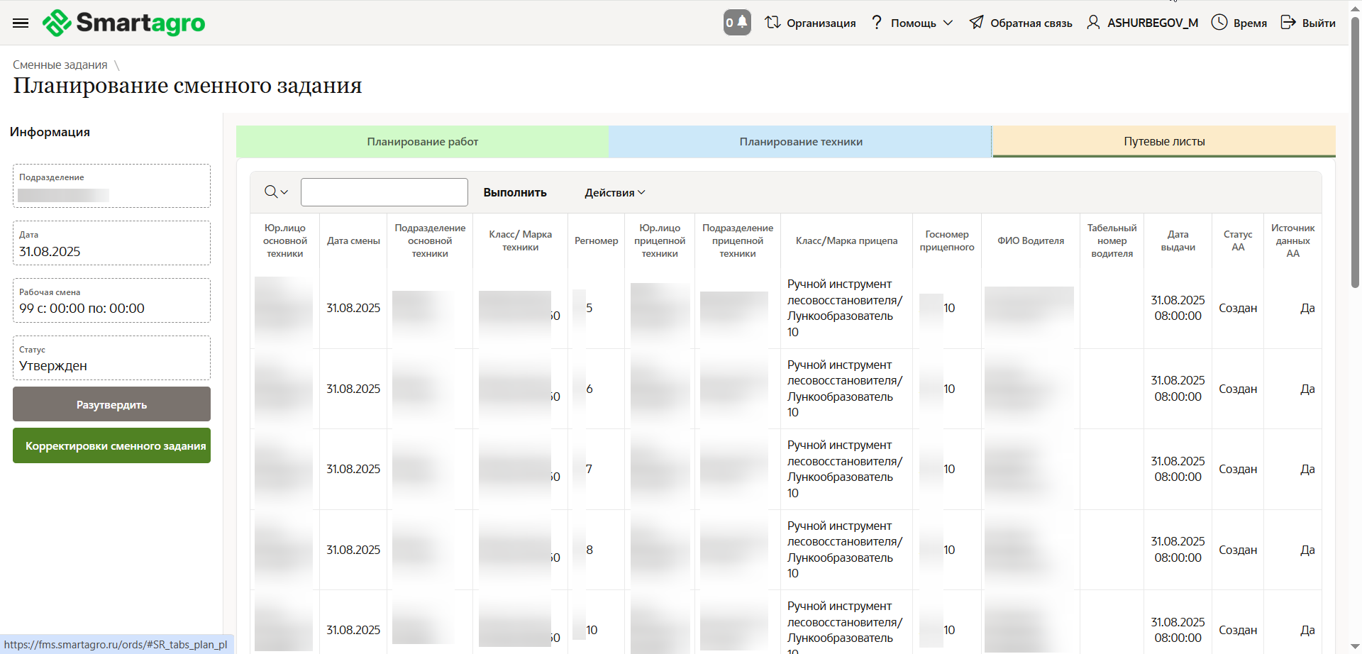В разделе «Сменные задания» отображаются все созданные путевые листы.