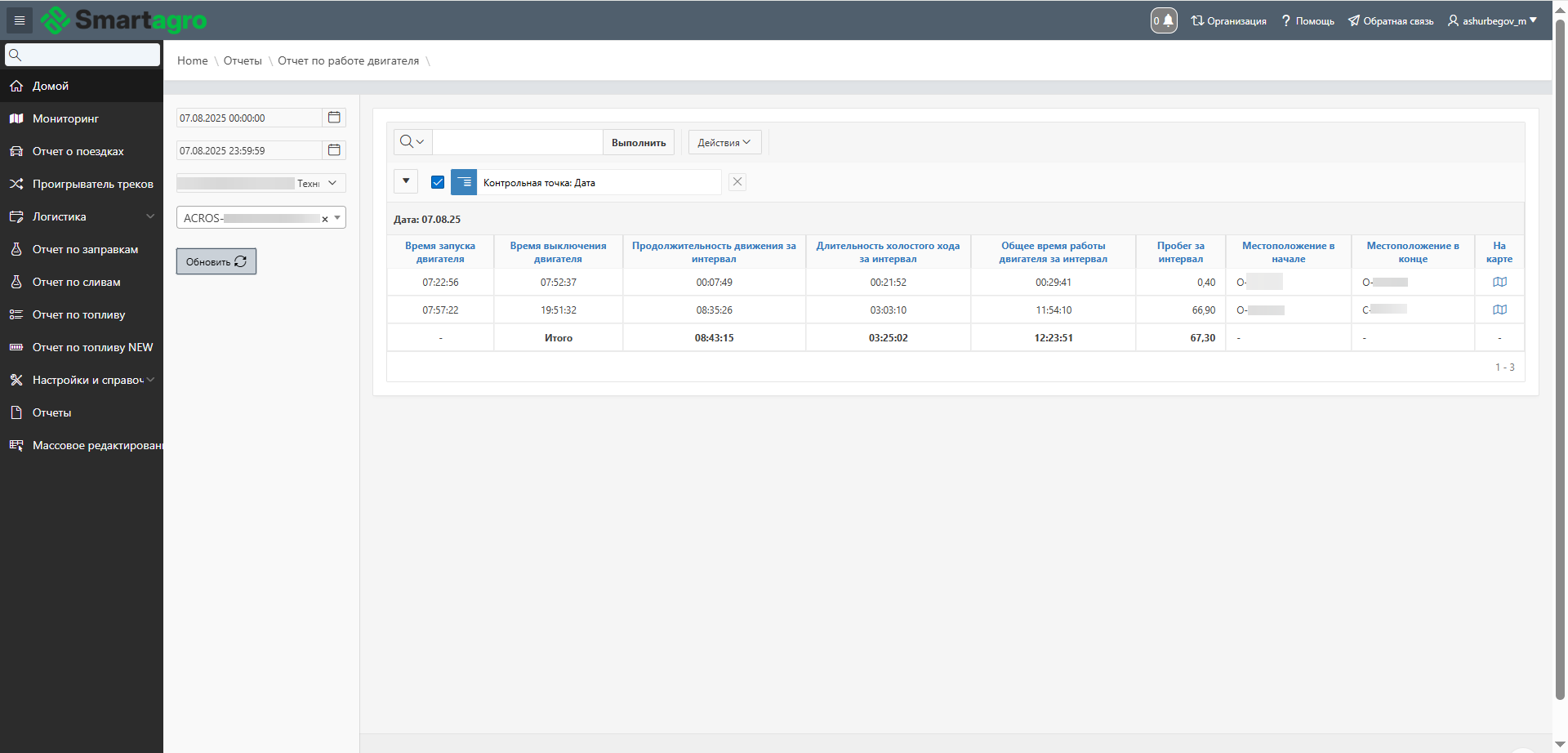 • Общее время работы двигателя за интервал - Сколько времени двигатель работал в совокупности на заданном интервале