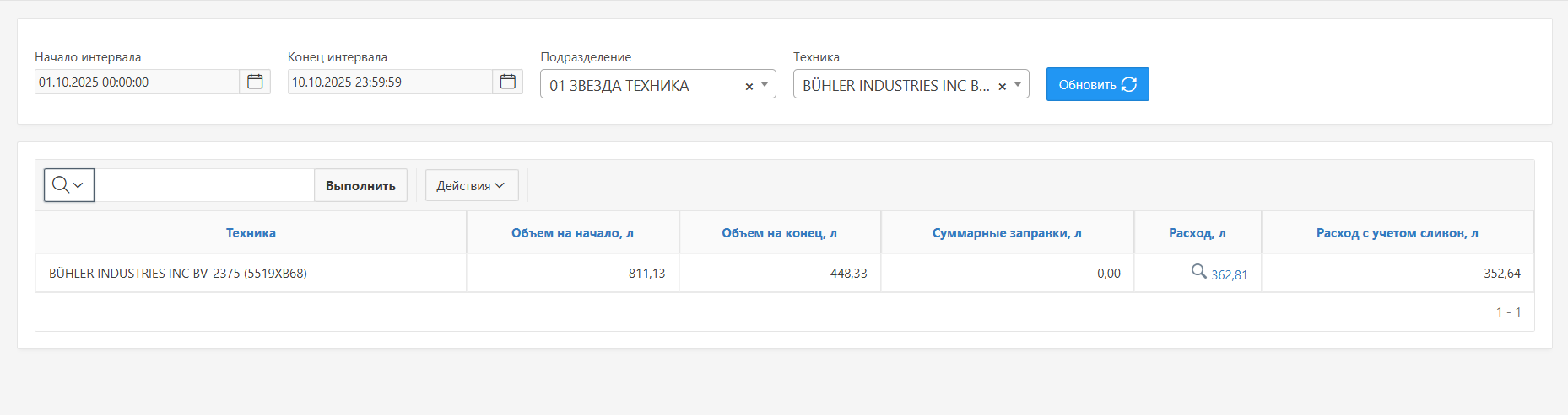 Дождаться обновления таблицы отчета; система рассчитает значения объемов на начало и конец периода, суммарных заправок, расхода и расхода с учетом сливов для каждой техники.
