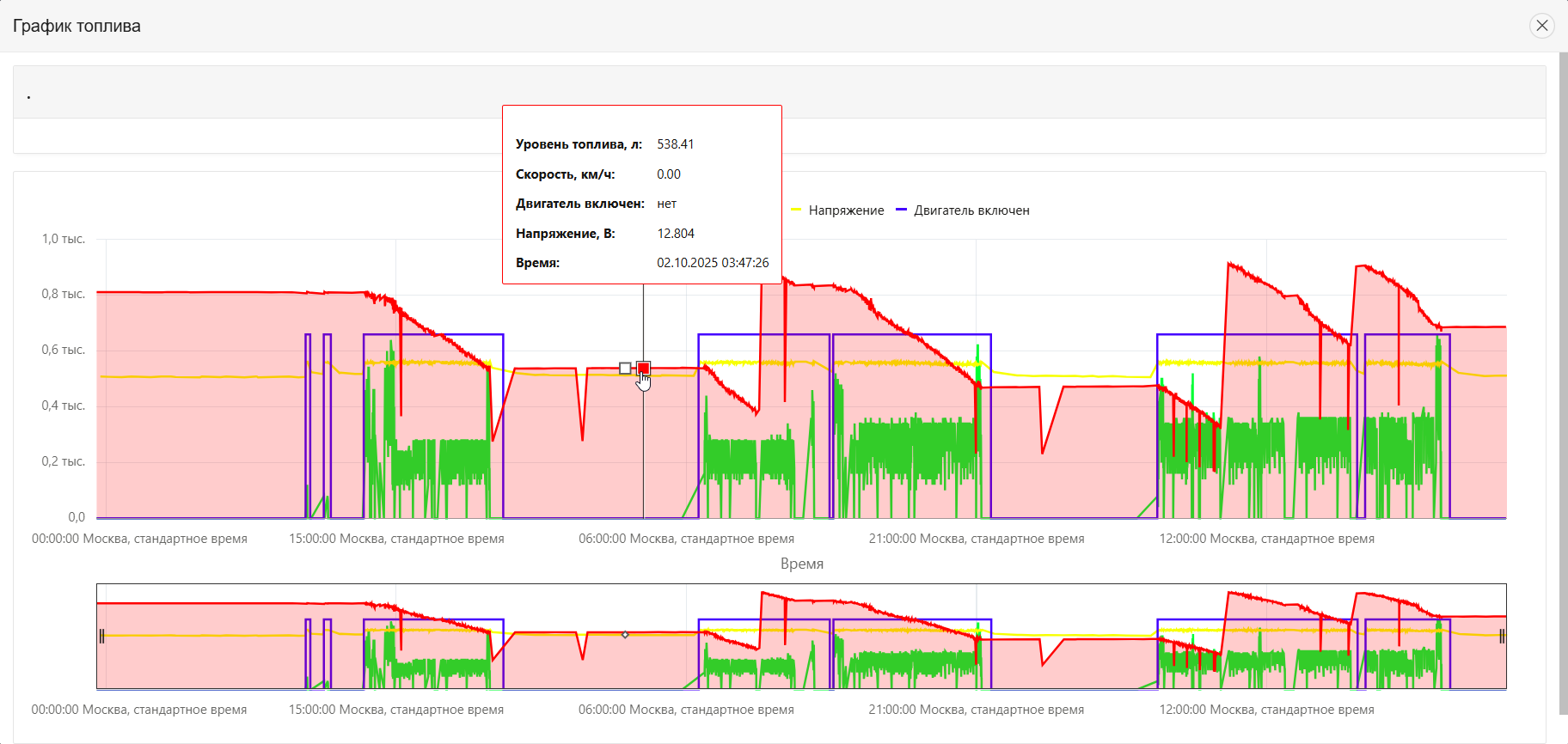 При наведении курсора мыши на любую точку графика отображается всплывающая подсказка с подробной информацией: уровень топлива, скорость, состояние двигателя, значение напряжения и точное время.