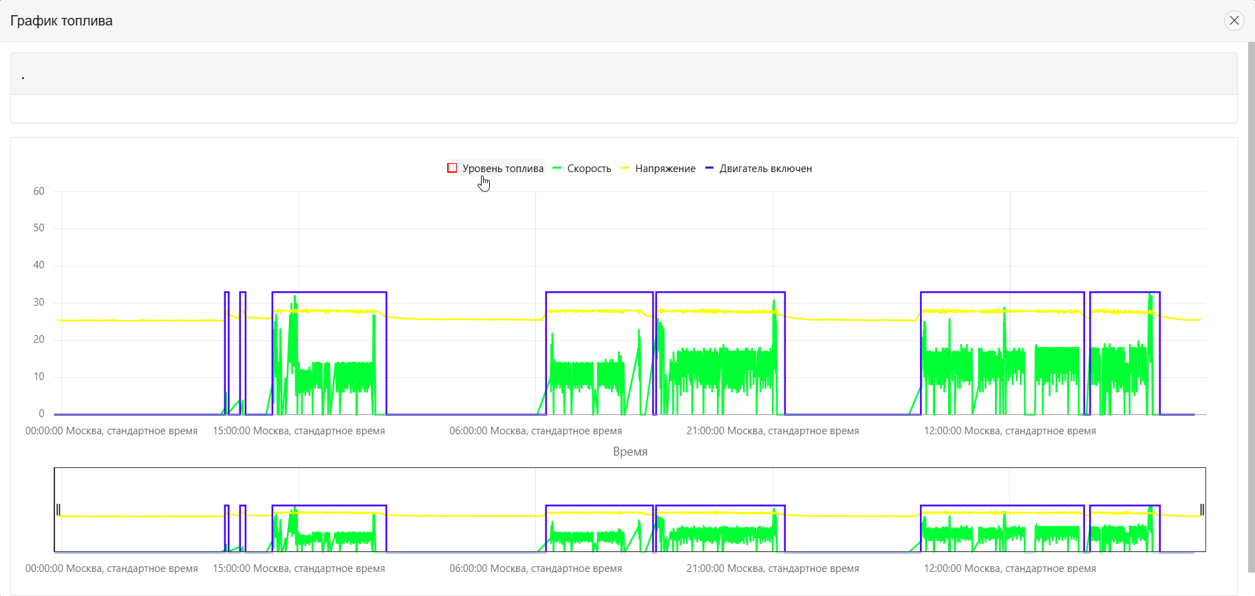 Навести курсор мыши на интересующую точку графика, чтобы отобразить подробную всплывающую подсказку (уровень топлива, скорость, напряжение, состояние двигателя, время).