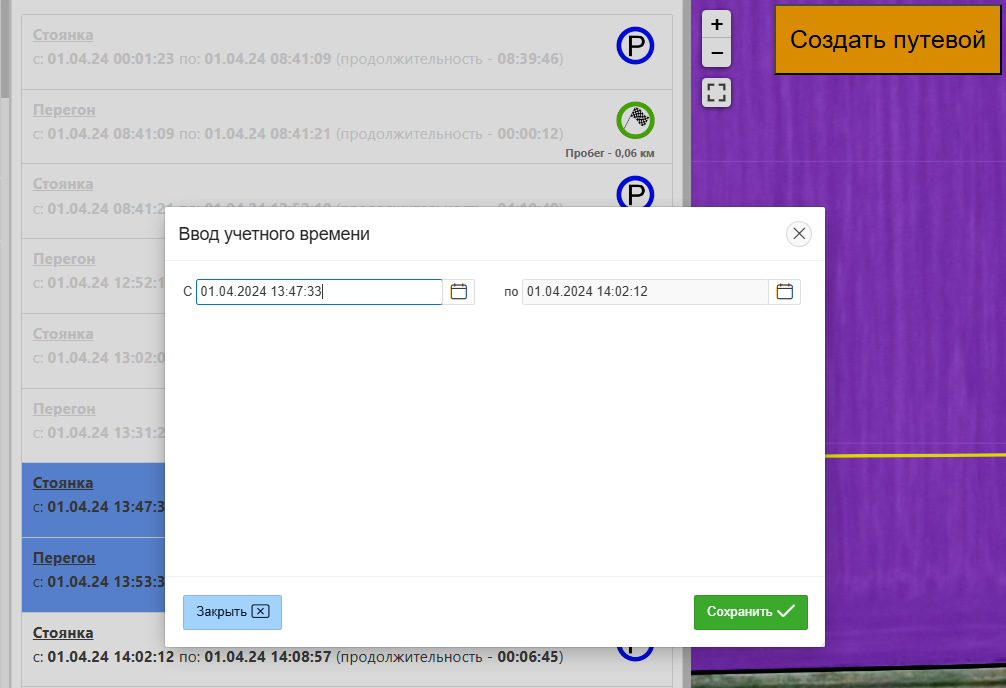 Для завершения создания необходимо нажать на кнопку . Откроется модальное окно с котором необходимо утвердить учетное время путевого листа (по умолчанию проставляется время выбранных событий) (при необходимости можно отредактировать) и нажать на кнопку . Путевой лист создан