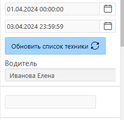 Для поиска необходимой техники можно воспользоваться инструментами фильтрации: по периоду, водителю, техники - нажать на кнопку