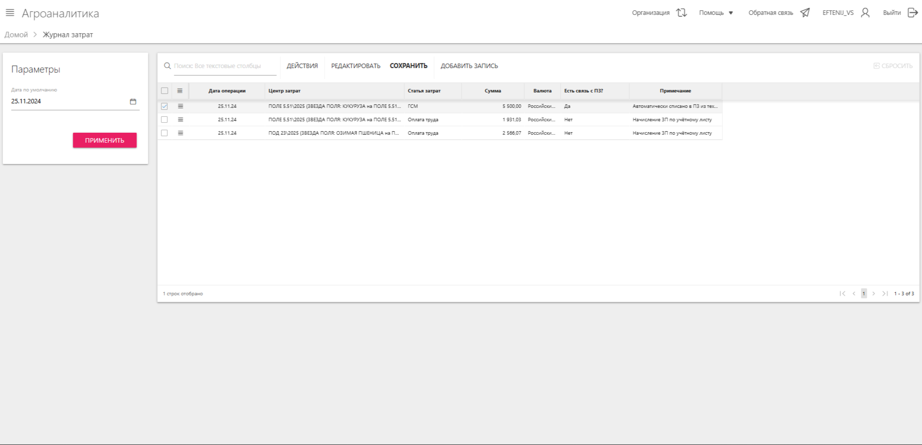 В графе "Центр затрат" указаны сведения о поле/севообороте/подразделении, на которые данные расходы были возложены.