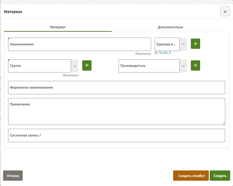 Чтобы создать новый материал, необходимо нажать на зеленую иконку , тогда откроется модальное окно по созданию нового материала.